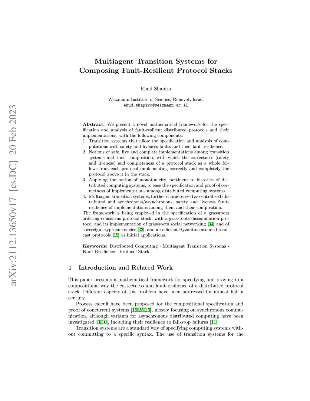 We present a novel mathematical framework for the specification and analysis of fault-resilient distributed protocols and their implementations, with the following components: 1. Transition systems that allow the specification and analysis of computations with safety and liveness faults and their fault resilience. 2. Notions of safe, live and complete implementations among transition systems and their composition, with which the correctness (safety and liveness) and completeness of a protocol stack as a whole follows from each protocol implementing correctly and completely the protocol above it in the stack. 3. Applying the notion of monotonicity, pertinent to histories of distributed computing systems, to ease the specification and proof of correctness of implementations among distributed computing systems. 4. Multiagent transition systems, further characterized as centralized/distributed and synchronous/asynchronous; safety and liveness fault-resilience of implementations among them and their composition. The framework is being employed in the specification of a grassroots ordering consensus protocol stack, with a grassroots dissemination protocol and its implementation of grassroots social networking and of sovereign cryptocurrencies, and an efficient Byzantine atomic broadcast protocols as initial applications.