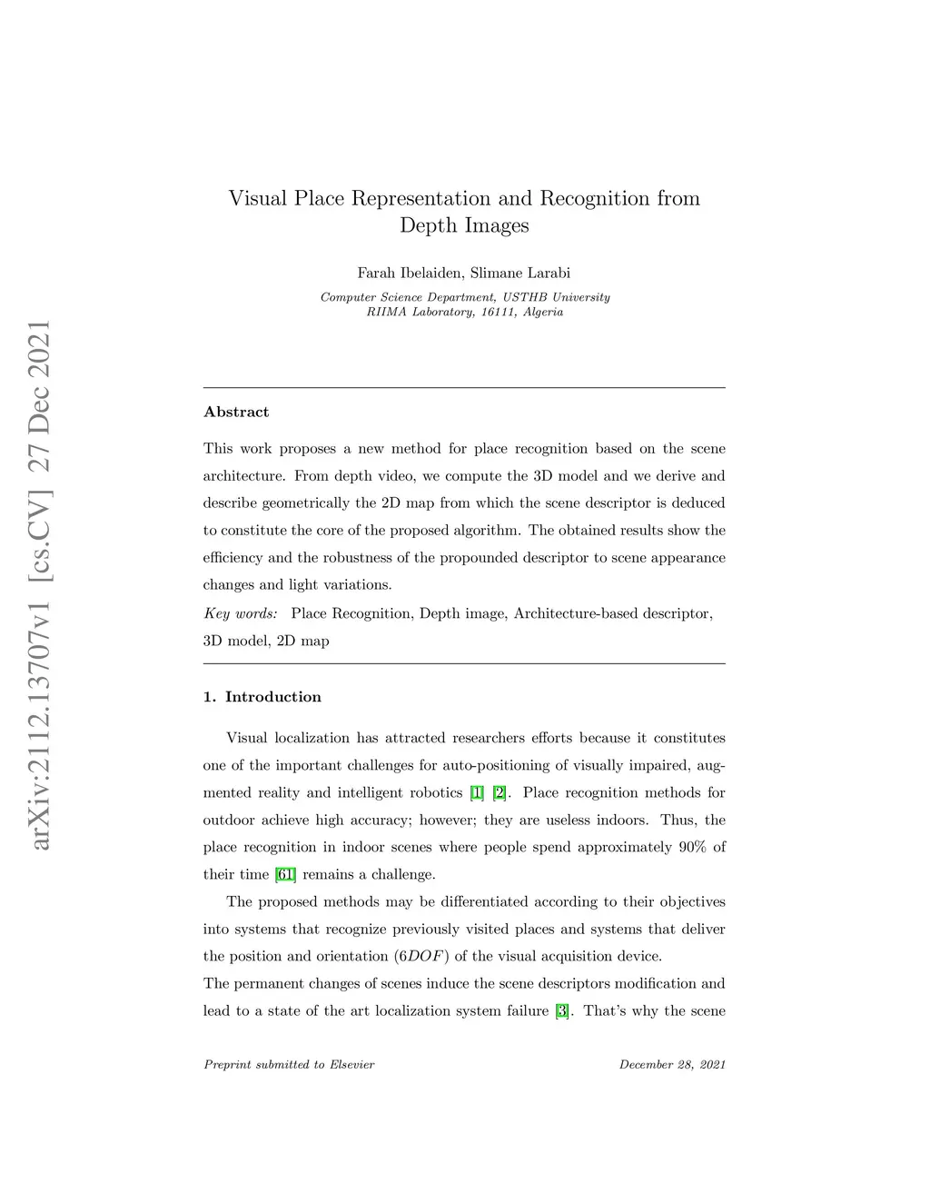 This work proposes a new method for place recognition based on the scene architecture. From depth video, we compute the 3D model and we derive and describe geometrically the 2D map from which the scene descriptor is deduced to constitute the core of the proposed algorithm. The obtained results show the efficiency and the robustness of the propounded descriptor to scene appearance changes and light variations.