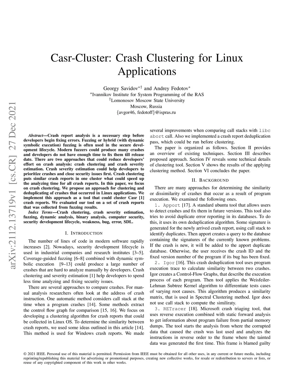 Crash report analysis is a necessary step before developers begin fixing errors. Fuzzing or hybrid (with dynamic symbolic execution) fuzzing is often used in the secure development lifecycle. Modern fuzzers could produce many crashes and developers do not have enough time to fix them till release date. There are two approaches that could reduce developers' effort on crash analysis: crash clustering and crash severity estimation. Crash severity estimation could help developers to prioritize crashes and close security issues first. Crash clustering puts similar crash reports in one cluster what could speed up the analyzing time for all crash reports. In this paper, we focus on crash clustering. We propose an approach for clustering and deduplicating of crashes that occurred in Linux applications. We implement this approach as a tool that could cluster Casr~\cite{fedotov2020casr} crash reports. We evaluated our tool on a set of crash reports that was collected from fuzzing results.