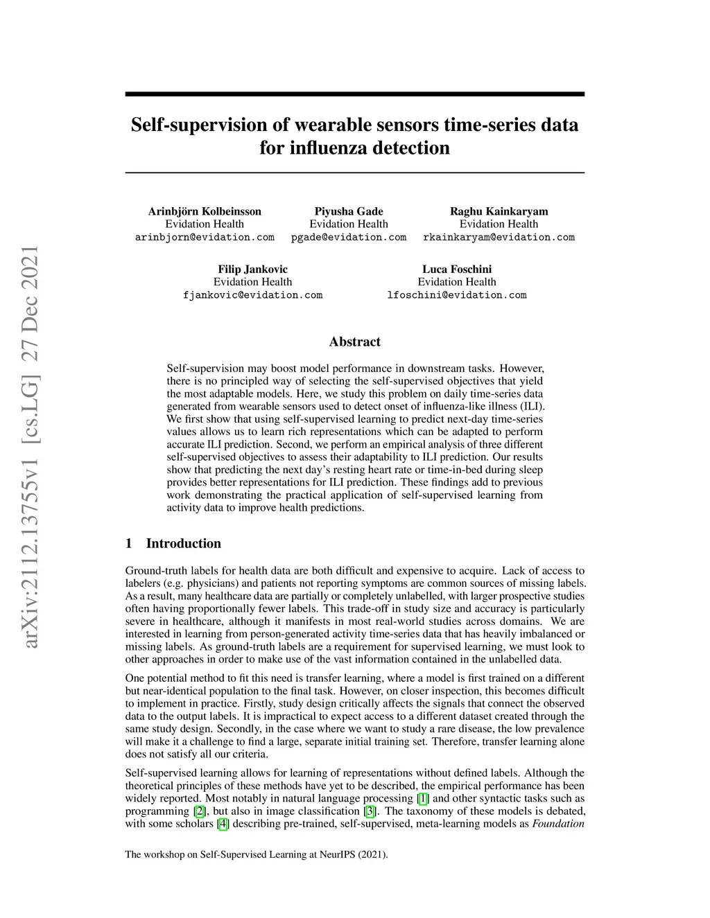 Self-supervision of wearable sensors time-series data for influenza