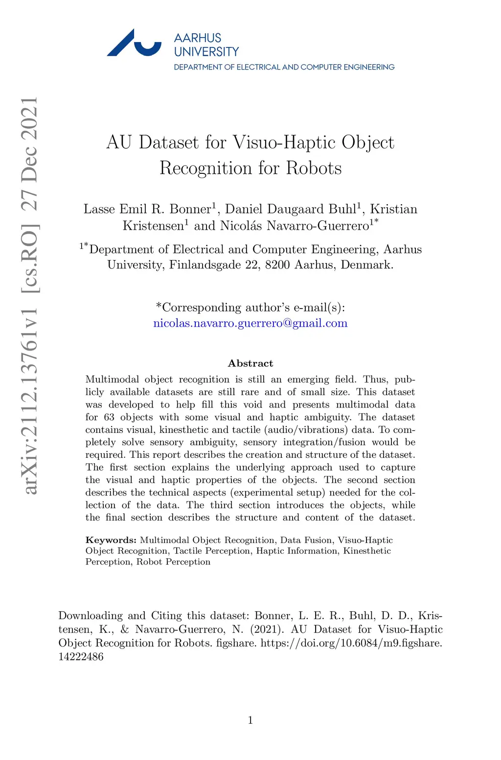 AU Dataset for Visuo-Haptic Object Recognition for Robots