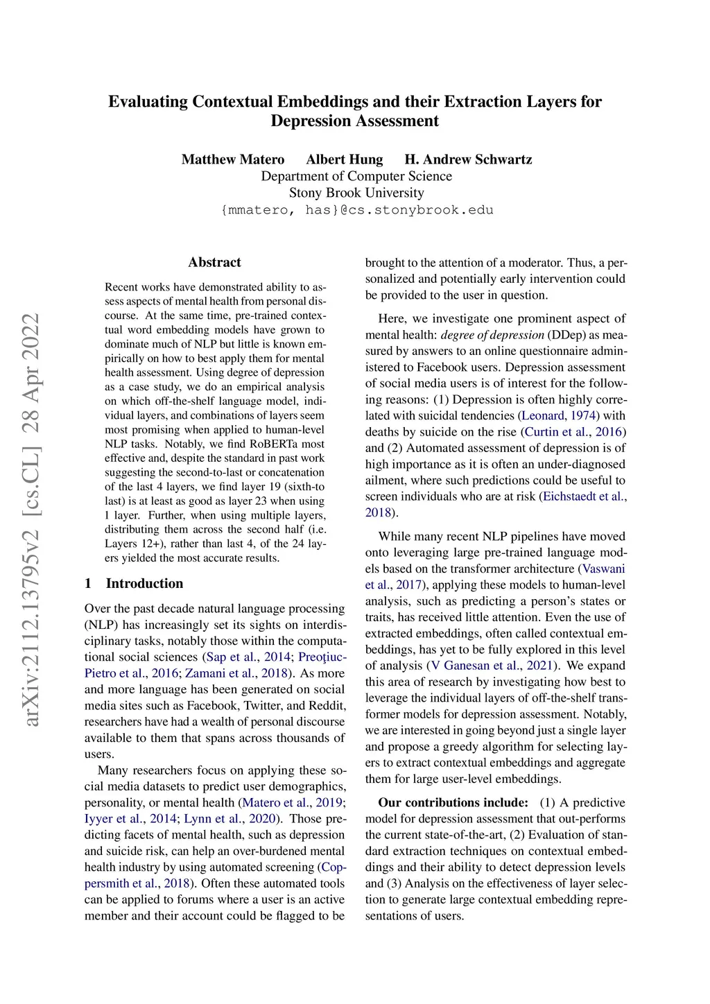 Recent works have demonstrated ability to assess aspects of mental health from personal discourse. At the same time, pre-trained contextual word embedding models have grown to dominate much of NLP but little is known empirically on how to best apply them for mental health assessment. Using degree of depression as a case study, we do an empirical analysis on which off-the-shelf language model, individual layers, and combinations of layers seem most promising when applied to human-level NLP tasks. Notably, we find RoBERTa most effective and, despite the standard in past work suggesting the second-to-last or concatenation of the last 4 layers, we find layer 19 (sixth-to last) is at least as good as layer 23 when using 1 layer. Further, when using multiple layers, distributing them across the second half (i.e. Layers 12+), rather than last 4, of the 24 layers yielded the most accurate results.