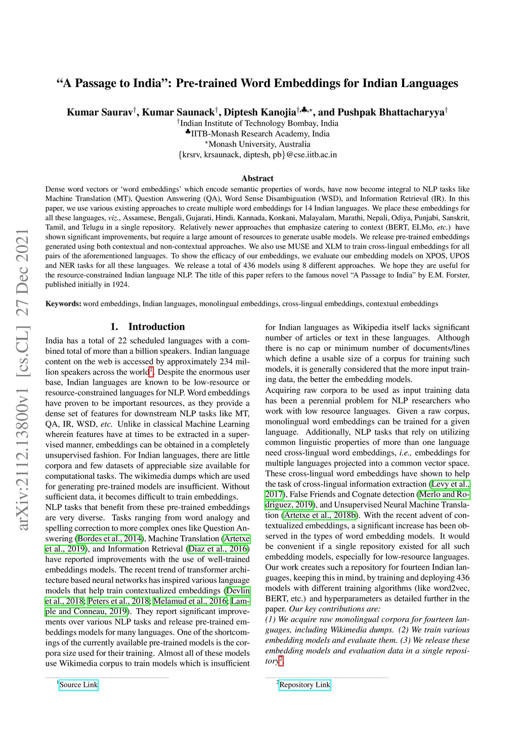 Dense word vectors or 'word embeddings' which encode semantic properties of words, have now become integral to NLP tasks like Machine Translation (MT), Question Answering (QA), Word Sense Disambiguation (WSD), and Information Retrieval (IR). In this paper, we use various existing approaches to create multiple word embeddings for 14 Indian languages. We place these embeddings for all these languages, viz., Assamese, Bengali, Gujarati, Hindi, Kannada, Konkani, Malayalam, Marathi, Nepali, Odiya, Punjabi, Sanskrit, Tamil, and Telugu in a single repository. Relatively newer approaches that emphasize catering to context (BERT, ELMo, etc.) have shown significant improvements, but require a large amount of resources to generate usable models. We release pre-trained embeddings generated using both contextual and non-contextual approaches. We also use MUSE and XLM to train cross-lingual embeddings for all pairs of the aforementioned languages. To show the efficacy of our embeddings, we evaluate our embedding models on XPOS, UPOS and NER tasks for all these languages. We release a total of 436 models using 8 different approaches. We hope they are useful for the resource-constrained Indian language NLP. The title of this paper refers to the famous novel Á Passage to India' by E.M. Forster, published initially in 1924.