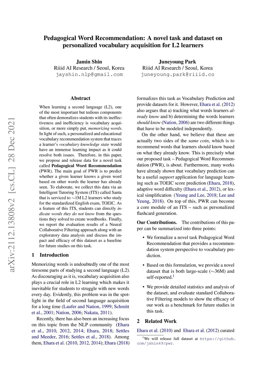 When learning a second language (L2), one of the most important but tedious components that often demoralizes students with its ineffectiveness and inefficiency is vocabulary acquisition, or more simply put, memorizing words. In light of such, a personalized and educational vocabulary recommendation system that traces a learner's vocabulary knowledge state would have an immense learning impact as it could resolve both issues. Therefore, in this paper, we propose and release data for a novel task called Pedagogical Word Recommendation (PWR). The main goal of PWR is to predict whether a given learner knows a given word based on other words the learner has already seen. To elaborate, we collect this data via an Intelligent Tutoring System (ITS) that is serviced to ~1M L2 learners who study for the standardized English exam, TOEIC. As a feature of this ITS, students can directly indicate words they do not know from the questions they solved to create wordbooks. Finally, we report the evaluation results of a Neural Collaborative Filtering approach along with an exploratory data analysis and discuss the impact and efficacy of this dataset as a baseline for future studies on this task.