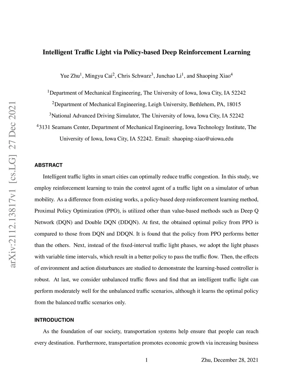 Intelligent traffic lights in smart cities can optimally reduce traffic congestion. In this study, we employ reinforcement learning to train the control agent of a traffic light on a simulator of urban mobility. As a difference from existing works, a policy-based deep reinforcement learning method, Proximal Policy Optimization (PPO), is utilized other than value-based methods such as Deep Q Network (DQN) and Double DQN (DDQN). At first, the obtained optimal policy from PPO is compared to those from DQN and DDQN. It is found that the policy from PPO performs better than the others. Next, instead of the fixed-interval traffic light phases, we adopt the light phases with variable time intervals, which result in a better policy to pass the traffic flow. Then, the effects of environment and action disturbances are studied to demonstrate the learning-based controller is robust. At last, we consider unbalanced traffic flows and find that an intelligent traffic light can perform moderately well for the unbalanced traffic scenarios, although it learns the optimal policy from the balanced traffic scenarios only.