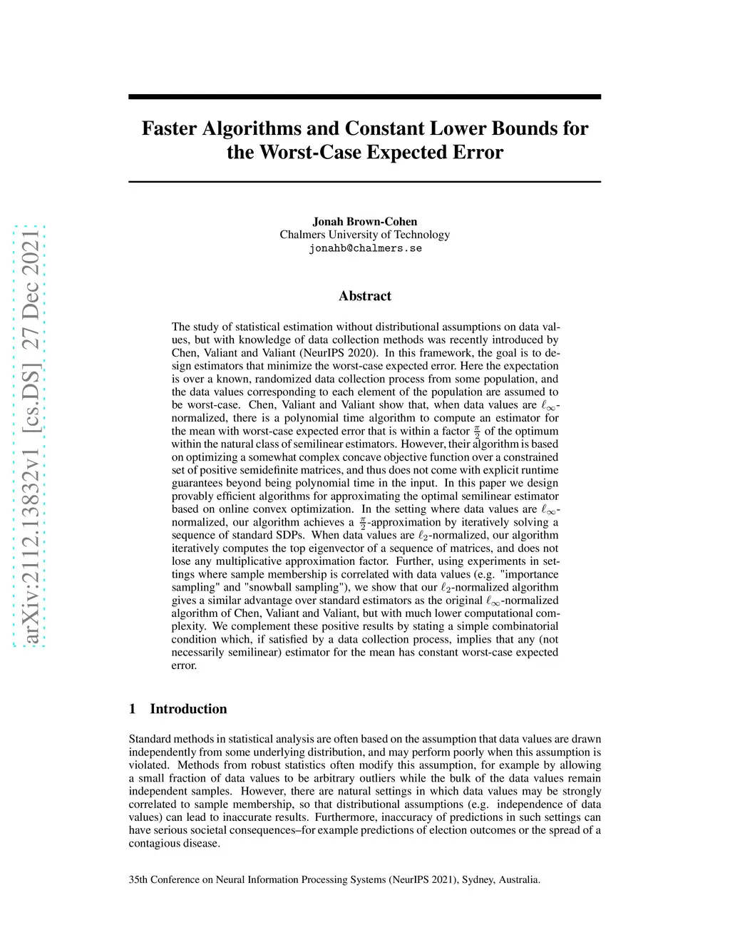 The study of statistical estimation without distributional assumptions on data values, but with knowledge of data collection methods was recently introduced by Chen, Valiant and Valiant (NeurIPS 2020). In this framework, the goal is to design estimators that minimize the worst-case expected error. Here the expectation is over a known, randomized data collection process from some population, and the data values corresponding to each element of the population are assumed to be worst-case. Chen, Valiant and Valiant show that, when data values are -normalized, there is a polynomial time algorithm to compute an estimator for the mean with worst-case expected error that is within a factor of the optimum within the natural class of semilinear estimators. However, their algorithm is based on optimizing a somewhat complex concave objective function over a constrained set of positive semidefinite matrices, and thus does not come with explicit runtime guarantees beyond being polynomial time in the input. In this paper we design provably efficient algorithms for approximating the optimal semilinear estimator based on online convex optimization. In the setting where data values are -normalized, our algorithm achieves a -approximation by iteratively solving a sequence of standard SDPs. When data values are -normalized, our algorithm iteratively computes the top eigenvector of a sequence of matrices, and does not lose any multiplicative approximation factor. We complement these positive results by stating a simple combinatorial condition which, if satisfied by a data collection process, implies that any (not necessarily semilinear) estimator for the mean has constant worst-case expected error.