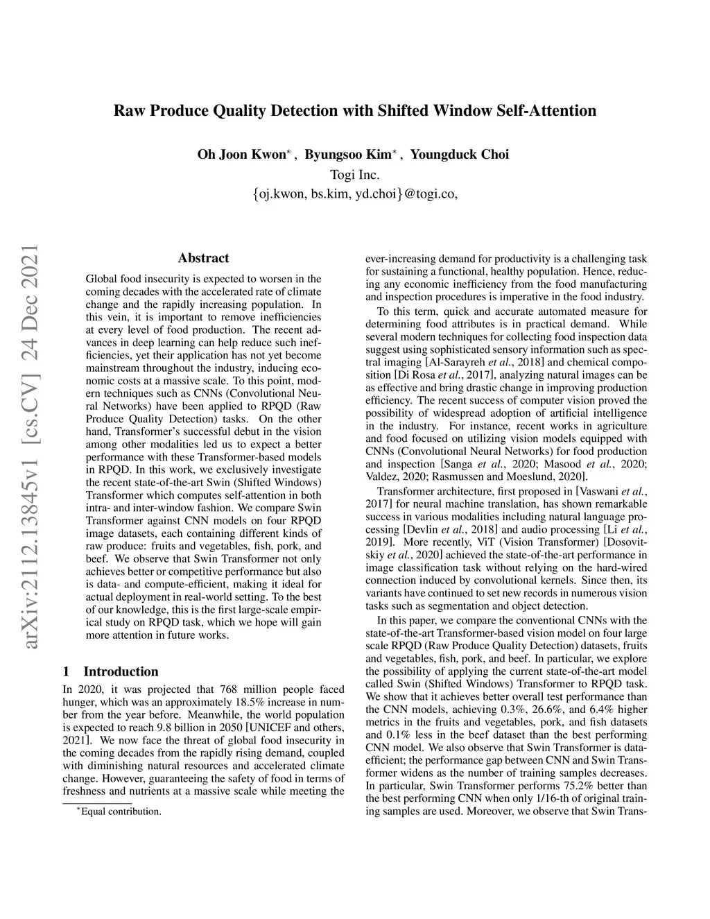 Raw Produce Quality Detection with Shifted Window Self-Attention