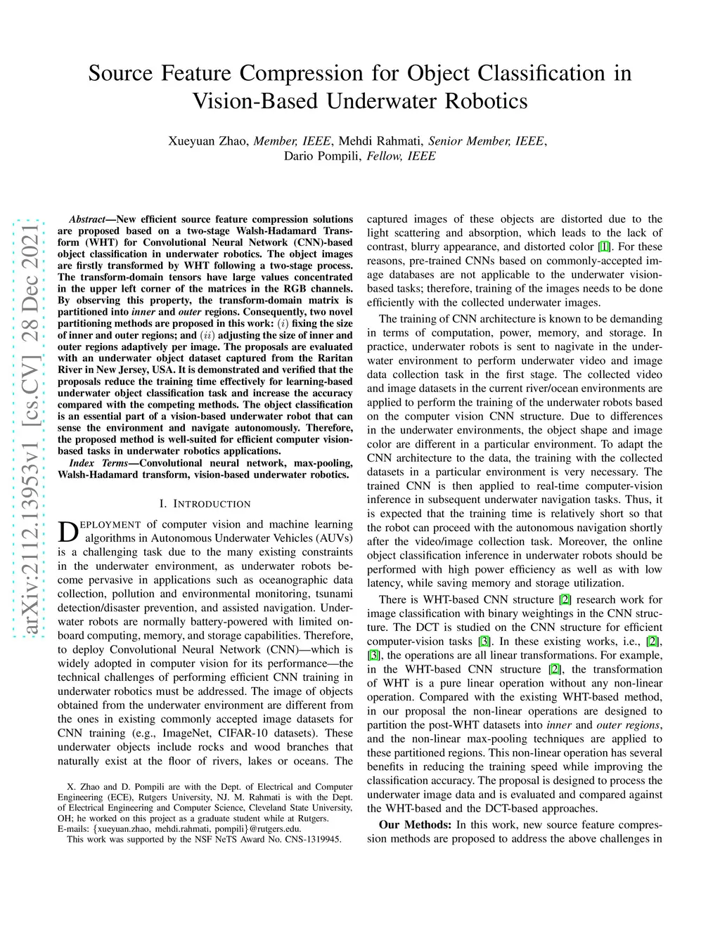 New efficient source feature compression solutions are proposed based on a two-stage Walsh-Hadamard Transform (WHT) for Convolutional Neural Network (CNN)-based object classification in underwater robotics. The object images are firstly transformed by WHT following a two-stage process. The transform-domain tensors have large values concentrated in the upper left corner of the matrices in the RGB channels. By observing this property, the transform-domain matrix is partitioned into inner and outer regions. Consequently, two novel partitioning methods are proposed in this work: (i) fixing the size of inner and outer regions; and (ii) adjusting the size of inner and outer regions adaptively per image. The proposals are evaluated with an underwater object dataset captured from the Raritan River in New Jersey, USA. It is demonstrated and verified that the proposals reduce the training time effectively for learning-based underwater object classification task and increase the accuracy compared with the competing methods. The object classification is an essential part of a vision-based underwater robot that can sense the environment and navigate autonomously. Therefore, the proposed method is well-suited for efficient computer vision-based tasks in underwater robotics applications.