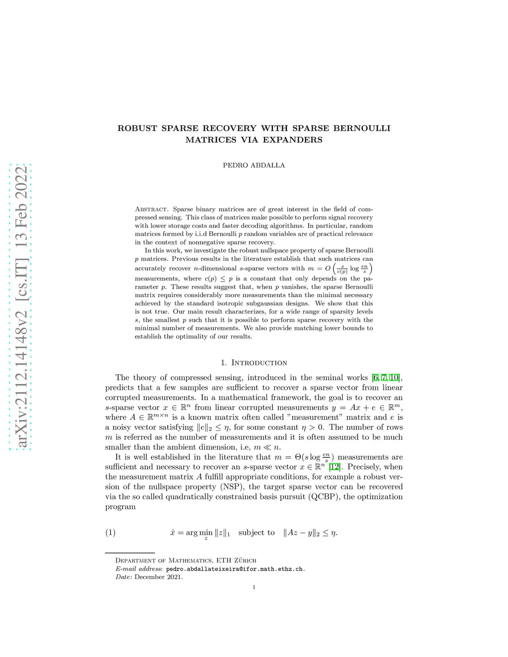 Robust Sparse Recovery with Sparse Bernoulli matrices via Expanders