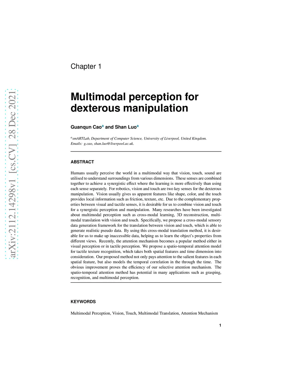 Humans usually perceive the world in a multimodal way that vision, touch, sound are utilised to understand surroundings from various dimensions. These senses are combined together to achieve a synergistic effect where the learning is more effectively than using each sense separately. For robotics, vision and touch are two key senses for the dexterous manipulation. Vision usually gives us apparent features like shape, color, and the touch provides local information such as friction, texture, etc. Due to the complementary properties between visual and tactile senses, it is desirable for us to combine vision and touch for a synergistic perception and manipulation. Many researches have been investigated about multimodal perception such as cross-modal learning, 3D reconstruction, multimodal translation with vision and touch. Specifically, we propose a cross-modal sensory data generation framework for the translation between vision and touch, which is able to generate realistic pseudo data. By using this cross-modal translation method, it is desirable for us to make up inaccessible data, helping us to learn the object's properties from different views. Recently, the attention mechanism becomes a popular method either in visual perception or in tactile perception. We propose a spatio-temporal attention model for tactile texture recognition, which takes both spatial features and time dimension into consideration. Our proposed method not only pays attention to the salient features in each spatial feature, but also models the temporal correlation in the through the time. The obvious improvement proves the efficiency of our selective attention mechanism. The spatio-temporal attention method has potential in many applications such as grasping, recognition, and multimodal perception.