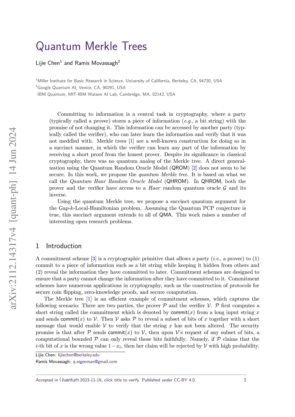 Committing to information is a central task in cryptography, where a party (typically called a prover) stores a piece of information (e.g., a bit string) with the promise of not changing it. This information can be accessed by another party (typically called the verifier), who can later learn the information and verify that it was not meddled with. Merkle trees are a well-known construction for doing so in a succinct manner, in which the verifier can learn any part of the information by receiving a short proof from the honest prover. Despite its significance in classical cryptography, there was no quantum analog of the Merkle tree. A direct generalization using the Quantum Random Oracle Model (QROM) does not seem to be secure. In this work, we propose the quantum Merkle tree. It is based on what we call the Quantum Haar Random Oracle Model (QHROM). In QHROM, both the prover and the verifier have access to a Haar random quantum oracle and its inverse. Using the quantum Merkle tree, we propose a succinct quantum argument for the Gap--Local-Hamiltonian problem. Assuming the Quantum PCP conjecture is true, this succinct argument extends to all of QMA. This work raises a number of interesting open research problems.