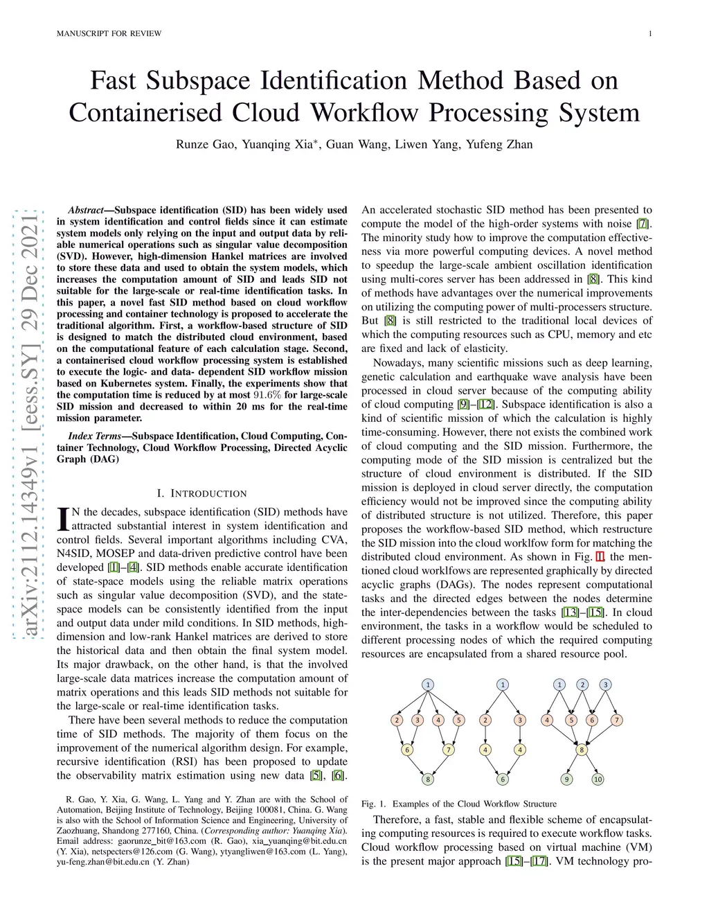 Subspace identification (SID) has been widely used in system identification and control fields since it can estimate system models only relying on the input and output data by reliable numerical operations such as singular value decomposition (SVD). However, high-dimension Hankel matrices are involved to store these data and used to obtain the system models, which increases the computation amount of SID and leads SID not suitable for the large-scale or real-time identification tasks. In this paper, a novel fast SID method based on cloud workflow processing and container technology is proposed to accelerate the traditional algorithm. First, a workflow-based structure of SID is designed to match the distributed cloud environment, based on the computational feature of each calculation stage. Second, a containerised cloud workflow processing system is established to execute the logic- and data- dependent SID workflow mission based on Kubernetes system. Finally, the experiments show that the computation time is reduced by at most for large-scale SID mission and decreased to within 20 ms for the real-time mission parameter.