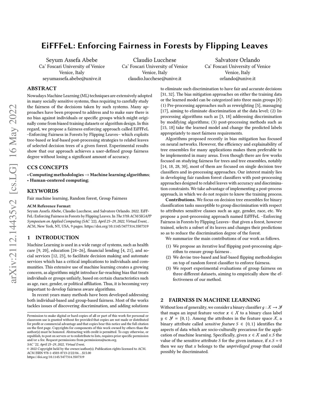 Nowadays Machine Learning (ML) techniques are extensively adopted in many socially sensitive systems, thus requiring to carefully study the fairness of the decisions taken by such systems. Many approaches have been proposed to address and to make sure there is no bias against individuals or specific groups which might originally come from biased training datasets or algorithm design. In this regard, we propose a fairness enforcing approach called EiFFFeL:Enforcing Fairness in Forests by Flipping Leaves which exploits tree-based or leaf-based post-processing strategies to relabel leaves of selected decision trees of a given forest. Experimental results show that our approach achieves a user defined group fairness degree without losing a significant amount of accuracy.