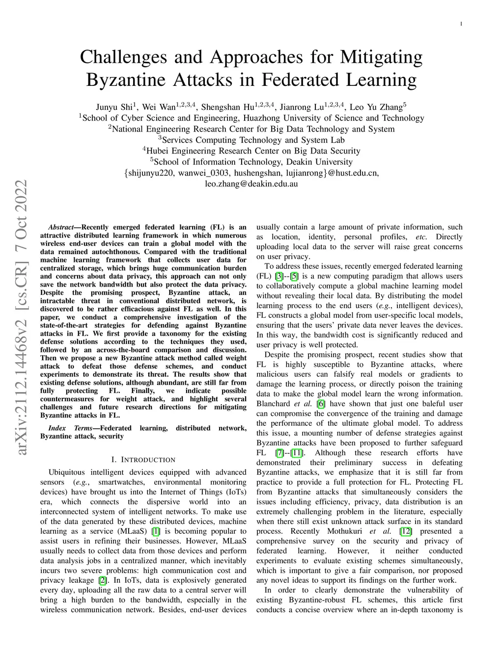 Recently emerged federated learning (FL) is an attractive distributed learning framework in which numerous wireless end-user devices can train a global model with the data remained autochthonous. Compared with the traditional machine learning framework that collects user data for centralized storage, which brings huge communication burden and concerns about data privacy, this approach can not only save the network bandwidth but also protect the data privacy. Despite the promising prospect, byzantine attack, an intractable threat in conventional distributed network, is discovered to be rather efficacious against FL as well. In this paper, we conduct a comprehensive investigation of the state-of-the-art strategies for defending against byzantine attacks in FL. We first provide a taxonomy for the existing defense solutions according to the techniques they used, followed by an across-the-board comparison and discussion. Then we propose a new byzantine attack method called weight attack to defeat those defense schemes, and conduct experiments to demonstrate its threat. The results show that existing defense solutions, although abundant, are still far from fully protecting FL. Finally, we indicate possible countermeasures for weight attack, and highlight several challenges and future research directions for mitigating byzantine attacks in FL.