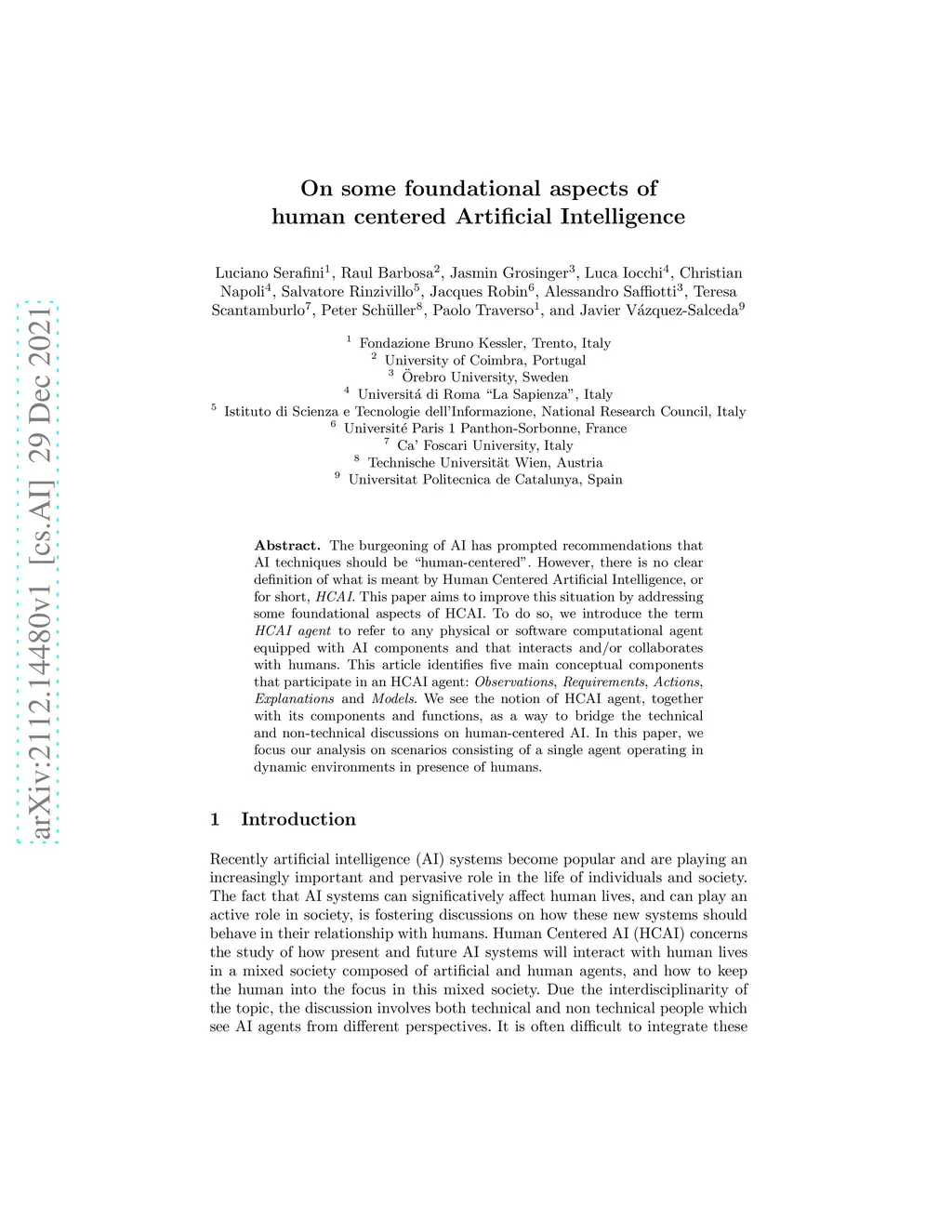 The burgeoning of AI has prompted recommendations that AI techniques should be "human-centered". However, there is no clear definition of what is meant by Human Centered Artificial Intelligence, or for short, HCAI. This paper aims to improve this situation by addressing some foundational aspects of HCAI. To do so, we introduce the term HCAI agent to refer to any physical or software computational agent equipped with AI components and that interacts and/or collaborates with humans. This article identifies five main conceptual components that participate in an HCAI agent: Observations, Requirements, Actions, Explanations and Models. We see the notion of HCAI agent, together with its components and functions, as a way to bridge the technical and non-technical discussions on human-centered AI. In this paper, we focus our analysis on scenarios consisting of a single agent operating in dynamic environments in presence of humans.