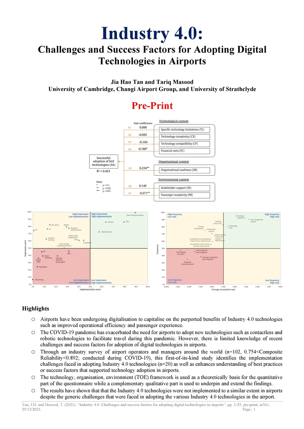 With the advent of Industry 4.0 technologies in the last decade, airports have undergone digitalisation to capitalise on the purported benefits of these technologies such as improved operational efficiency and passenger experience. The ongoing COVID-19 pandemic with emergence of its variants (e.g. Delta, Omicron) has exacerbated the need for airports to adopt new technologies such as contactless and robotic technologies to facilitate travel during this pandemic. However, there is limited knowledge of recent challenges and success factors for adoption of digital technologies in airports. Therefore, through an industry survey of airport operators and managers around the world (n=102, 0.754<Composite Reliability<0.892; conducted during COVID-19), this study identifies the challenges faced in adopting Industry 4.0 technologies (n=20) as well as enhances understanding of best practices or success factors that supported technology adoption in airports. The widely used technology, organisation, environment (TOE) framework is used as a theoretically basis for the quantitative part of the questionnaire. A complementary qualitative part is used to underpin and extend the findings. The industry survey is the first-of-its-kind that was conducted to understand the implementation challenges that airport operators face in adopting Industry 4.0 technologies in the airport. The survey results have shown that that the Industry 4.0 technologies were not implemented to a similar extent in airports despite the generic challenges that were faced in adopting the various Industry 4.0 technologies in the airport.