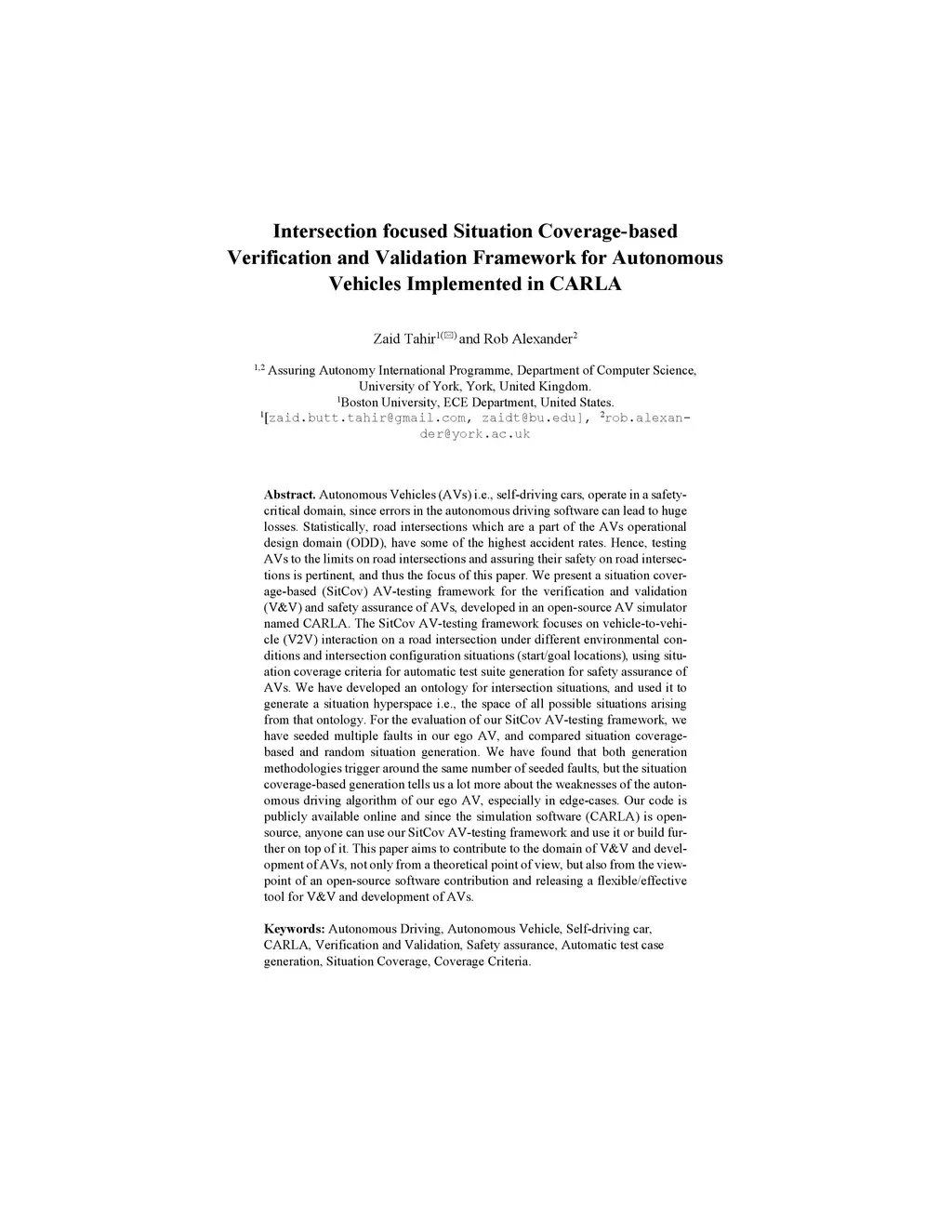 Autonomous Vehicles (AVs) i.e., self-driving cars, operate in a safety critical domain, since errors in the autonomous driving software can lead to huge losses. Statistically, road intersections which are a part of the AVs operational design domain (ODD), have some of the highest accident rates. Hence, testing AVs to the limits on road intersections and assuring their safety on road intersections is pertinent, and thus the focus of this paper. We present a situation coverage-based (SitCov) AV-testing framework for the verification and validation (V&V) and safety assurance of AVs, developed in an open-source AV simulator named CARLA. The SitCov AV-testing framework focuses on vehicle-to-vehicle interaction on a road intersection under different environmental and intersection configuration situations, using situation coverage criteria for automatic test suite generation for safety assurance of AVs. We have developed an ontology for intersection situations, and used it to generate a situation hyperspace i.e., the space of all possible situations arising from that ontology. For the evaluation of our SitCov AV-testing framework, we have seeded multiple faults in our ego AV, and compared situation coverage based and random situation generation. We have found that both generation methodologies trigger around the same number of seeded faults, but the situation coverage-based generation tells us a lot more about the weaknesses of the autonomous driving algorithm of our ego AV, especially in edge-cases. Our code is publicly available online, anyone can use our SitCov AV-testing framework and use it or build further on top of it. This paper aims to contribute to the domain of V&V and development of AVs, not only from a theoretical point of view, but also from the viewpoint of an open-source software contribution and releasing a flexible/effective tool for V&V and development of AVs.