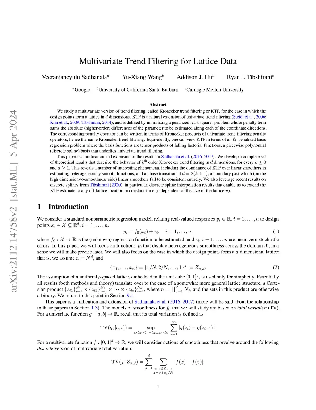 We study a multivariate version of trend filtering, called Kronecker trend filtering or KTF, for the case in which the design points form a lattice in dimensions. KTF is a natural extension of univariate trend filtering (Steidl et al., 2006; Kim et al., 2009; Tibshirani, 2014), and is defined by minimizing a penalized least squares problem whose penalty term sums the absolute (higher-order) differences of the parameter to be estimated along each of the coordinate directions. The corresponding penalty operator can be written in terms of Kronecker products of univariate trend filtering penalty operators, hence the name Kronecker trend filtering. Equivalently, one can view KTF in terms of an -penalized basis regression problem where the basis functions are tensor products of falling factorial functions, a piecewise polynomial (discrete spline) basis that underlies univariate trend filtering. This paper is a unification and extension of the results in Sadhanala et al. (2016, 2017). We develop a complete set of theoretical results that describe the behavior of order Kronecker trend filtering in dimensions, for every and . This reveals a number of interesting phenomena, including the dominance of KTF over linear smoothers in estimating heterogeneously smooth functions, and a phase transition at , a boundary past which (on the high dimension-to-smoothness side) linear smoothers fail to be consistent entirely. We also leverage recent results on discrete splines from Tibshirani (2020), in particular, discrete spline interpolation results that enable us to extend the KTF estimate to any off-lattice location in constant-time (independent of the size of the lattice ).