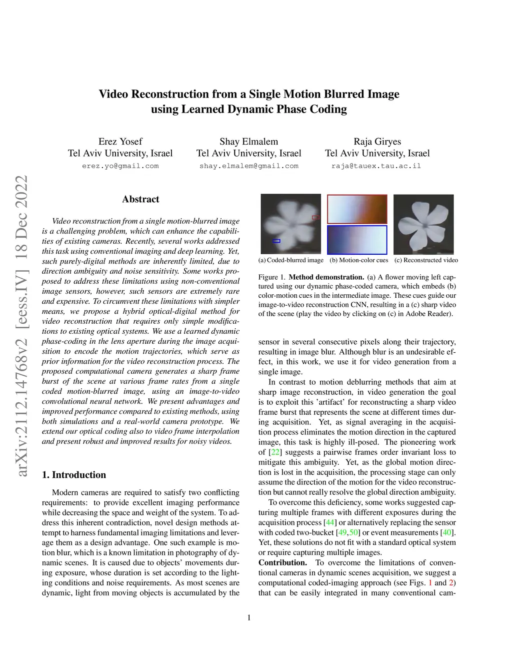 Video reconstruction from a single motion-blurred image is a challenging problem, which can enhance the capabilities of existing cameras. Recently, several works addressed this task using conventional imaging and deep learning. Yet, such purely-digital methods are inherently limited, due to direction ambiguity and noise sensitivity. Some works proposed to address these limitations using non-conventional image sensors, however, such sensors are extremely rare and expensive. To circumvent these limitations with simpler means, we propose a hybrid optical-digital method for video reconstruction that requires only simple modifications to existing optical systems. We use a learned dynamic phase-coding in the lens aperture during the image acquisition to encode the motion trajectories, which serve as prior information for the video reconstruction process. The proposed computational camera generates a sharp frame burst of the scene at various frame rates from a single coded motion-blurred image, using an image-to-video convolutional neural network. We present advantages and improved performance compared to existing methods, using both simulations and a real-world camera prototype. We extend our optical coding also to video frame interpolation and present robust and improved results for noisy videos.