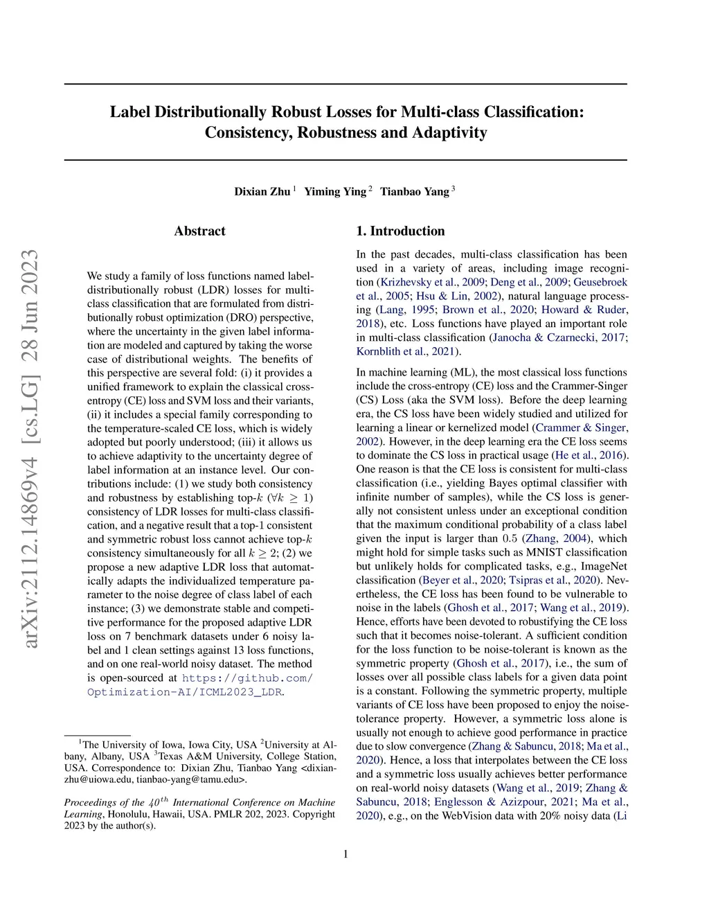 We study a family of loss functions named label-distributionally robust (LDR) losses for multi-class classification that are formulated from distributionally robust optimization (DRO) perspective, where the uncertainty in the given label information are modeled and captured by taking the worse case of distributional weights. The benefits of this perspective are several fold: (i) it provides a unified framework to explain the classical cross-entropy (CE) loss and SVM loss and their variants, (ii) it includes a special family corresponding to the temperature-scaled CE loss, which is widely adopted but poorly understood; (iii) it allows us to achieve adaptivity to the uncertainty degree of label information at an instance level. Our contributions include: (1) we study both consistency and robustness by establishing top- () consistency of LDR losses for multi-class classification, and a negative result that a top- consistent and symmetric robust loss cannot achieve top- consistency simultaneously for all ; (2) we propose a new adaptive LDR loss that automatically adapts the individualized temperature parameter to the noise degree of class label of each instance; (3) we demonstrate stable and competitive performance for the proposed adaptive LDR loss on 7 benchmark datasets under 6 noisy label and 1 clean settings against 13 loss functions, and on one real-world noisy dataset. The code is open-sourced at \url{https://github.com/Optimization-AI/ICML2023_LDR}.