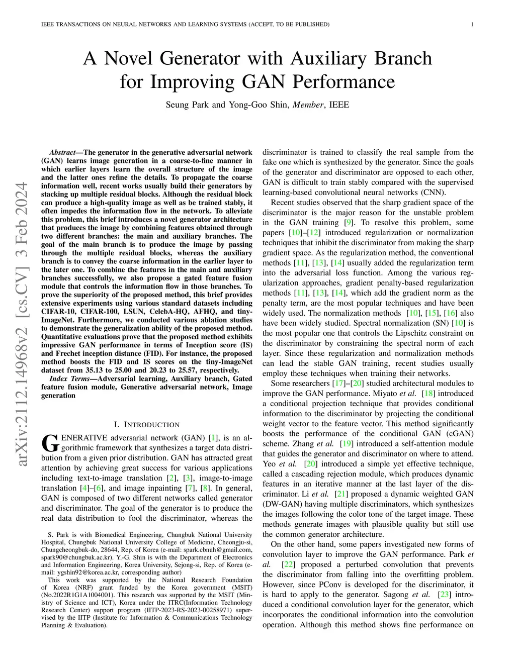 The generator in the generative adversarial network (GAN) learns image generation in a coarse-to-fine manner in which earlier layers learn the overall structure of the image and the latter ones refine the details. To propagate the coarse information well, recent works usually build their generators by stacking up multiple residual blocks. Although the residual block can produce a high-quality image as well as be trained stably, it often impedes the information flow in the network. To alleviate this problem, this brief introduces a novel generator architecture that produces the image by combining features obtained through two different branches: the main and auxiliary branches. The goal of the main branch is to produce the image by passing through the multiple residual blocks, whereas the auxiliary branch is to convey the coarse information in the earlier layer to the later one. To combine the features in the main and auxiliary branches successfully, we also propose a gated feature fusion module that controls the information flow in those branches. To prove the superiority of the proposed method, this brief provides extensive experiments using various standard datasets including CIFAR-10, CIFAR-100, LSUN, CelebA-HQ, AFHQ, and tiny-ImageNet. Furthermore, we conducted various ablation studies to demonstrate the generalization ability of the proposed method. Quantitative evaluations prove that the proposed method exhibits impressive GAN performance in terms of Inception score (IS) and Frechet inception distance (FID). For instance, the proposed method boosts the FID and IS scores on the tiny-ImageNet dataset from 35.13 to 25.00 and 20.23 to 25.57, respectively.