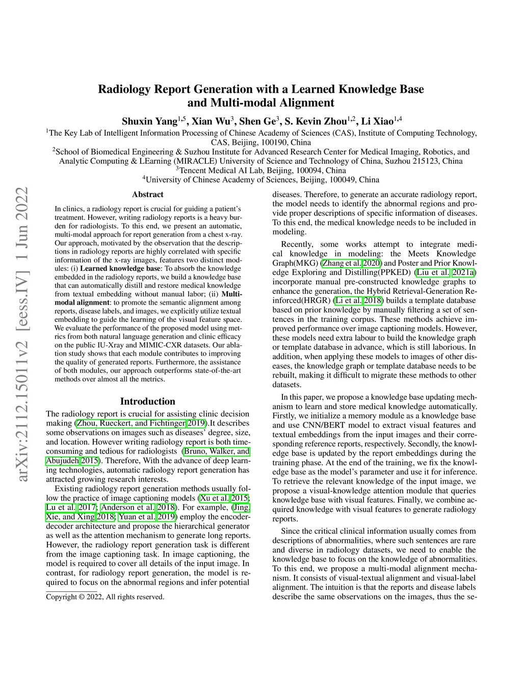 In clinics, a radiology report is crucial for guiding a patient's treatment. However, writing radiology reports is a heavy burden for radiologists. To this end, we present an automatic, multi-modal approach for report generation from a chest x-ray. Our approach, motivated by the observation that the descriptions in radiology reports are highly correlated with specific information of the x-ray images, features two distinct modules: (i) Learned knowledge base: To absorb the knowledge embedded in the radiology reports, we build a knowledge base that can automatically distil and restore medical knowledge from textual embedding without manual labour; (ii) Multi-modal alignment: to promote the semantic alignment among reports, disease labels, and images, we explicitly utilize textual embedding to guide the learning of the visual feature space. We evaluate the performance of the proposed model using metrics from both natural language generation and clinic efficacy on the public IU-Xray and MIMIC-CXR datasets. Our ablation study shows that each module contributes to improving the quality of generated reports. Furthermore, with the assistance of both modules, our approach outperforms state-of-the-art methods over almost all the metrics.