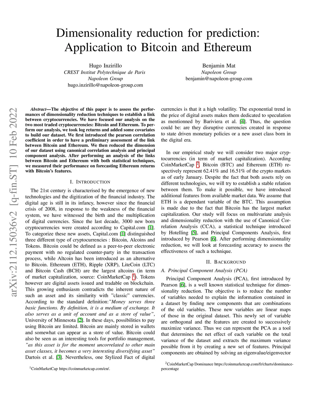 The objective of this paper is to assess the performances of dimensionality reduction techniques to establish a link between cryptocurrencies. We have focused our analysis on the two most traded cryptocurrencies: Bitcoin and Ethereum. To perform our analysis, we took log returns and added some covariates to build our data set. We first introduced the pearson correlation coefficient in order to have a preliminary assessment of the link between Bitcoin and Ethereum. We then reduced the dimension of our data set using canonical correlation analysis and principal component analysis. After performing an analysis of the links between Bitcoin and Ethereum with both statistical techniques, we measured their performance on forecasting Ethereum returns with Bitcoin s features.