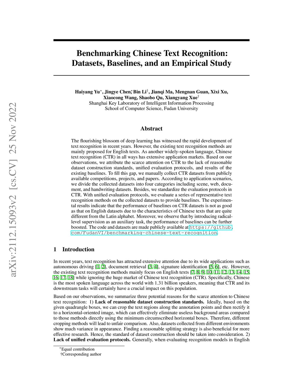 Benchmarking Chinese Text Recognition: Datasets, Baselines, and an