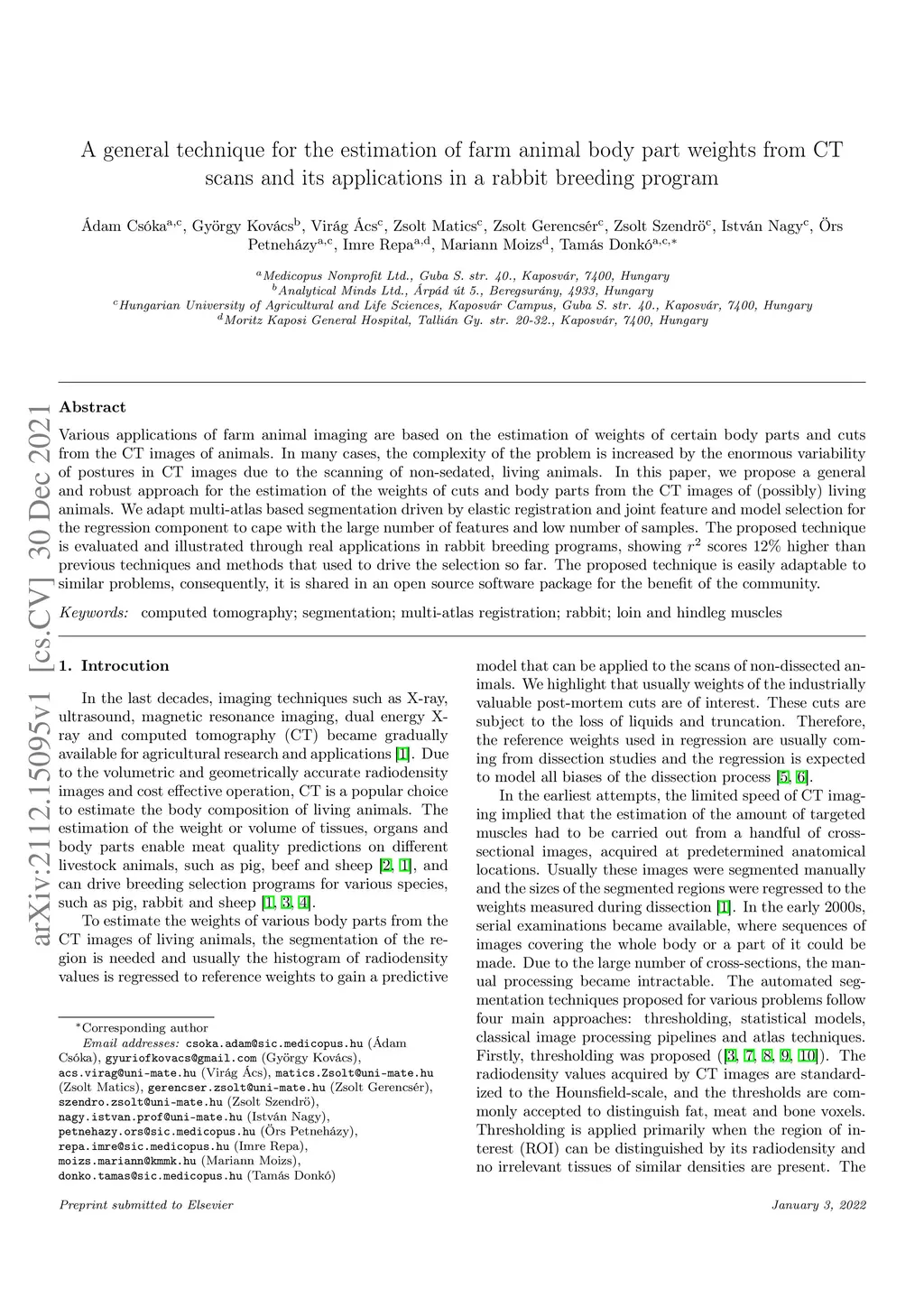 Various applications of farm animal imaging are based on the estimation of weights of certain body parts and cuts from the CT images of animals. In many cases, the complexity of the problem is increased by the enormous variability of postures in CT images due to the scanning of non-sedated, living animals. In this paper, we propose a general and robust approach for the estimation of the weights of cuts and body parts from the CT images of (possibly) living animals. We adapt multi-atlas based segmentation driven by elastic registration and joint feature and model selection for the regression component to cape with the large number of features and low number of samples. The proposed technique is evaluated and illustrated through real applications in rabbit breeding programs, showing r^2 scores 12% higher than previous techniques and methods that used to drive the selection so far. The proposed technique is easily adaptable to similar problems, consequently, it is shared in an open source software package for the benefit of the community.