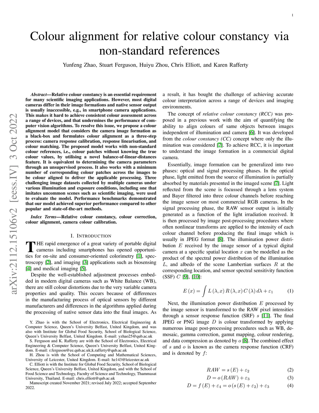 Relative colour constancy is an essential requirement for many scientific imaging applications. However, most digital cameras differ in their image formations and native sensor output is usually inaccessible, e.g., in smartphone camera applications. This makes it hard to achieve consistent colour assessment across a range of devices, and that undermines the performance of computer vision algorithms. To resolve this issue, we propose a colour alignment model that considers the camera image formation as a black-box and formulates colour alignment as a three-step process: camera response calibration, response linearisation, and colour matching. The proposed model works with non-standard colour references, i.e., colour patches without knowing the true colour values, by utilising a novel balance-of-linear-distances feature. It is equivalent to determining the camera parameters through an unsupervised process. It also works with a minimum number of corresponding colour patches across the images to be colour aligned to deliver the applicable processing. Two challenging image datasets collected by multiple cameras under various illumination and exposure conditions were used to evaluate the model. Performance benchmarks demonstrated that our model achieved superior performance compared to other popular and state-of-the-art methods.