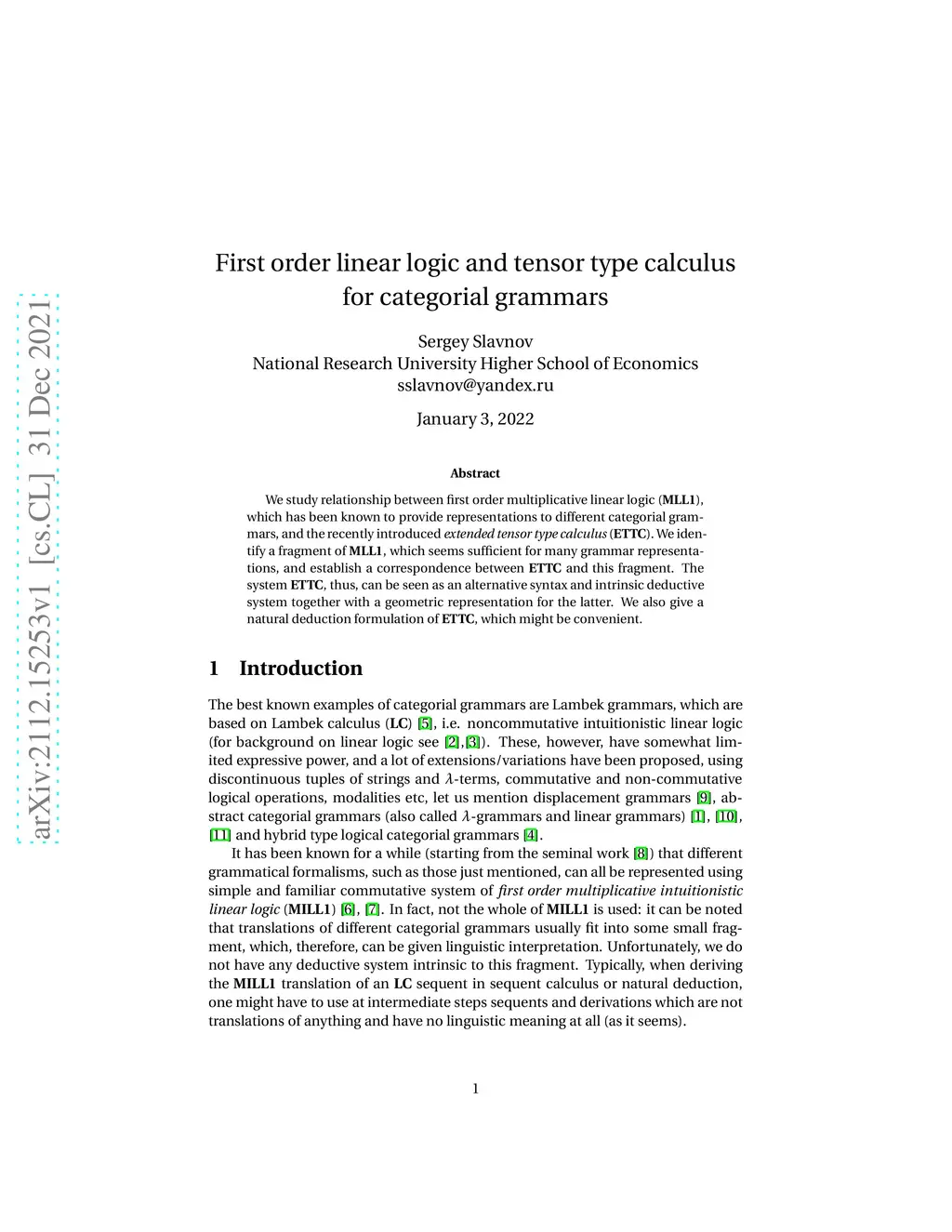 We study relationship between first order multiplicative linear logic (MLL1), which has been known to provide representations to different categorial grammars, and the recently introduced extended tensor type calculus (ETTC). We identify a fragment of MLL1, which seems sufficient for many grammar representations, and establish a correspondence between ETTC and this fragment. The system ETTC, thus, can be seen as an alternative syntax and intrinsic deductive system together with a geometric representation for the latter. We also give a natural deduction formulation of ETTC, which might be convenient.