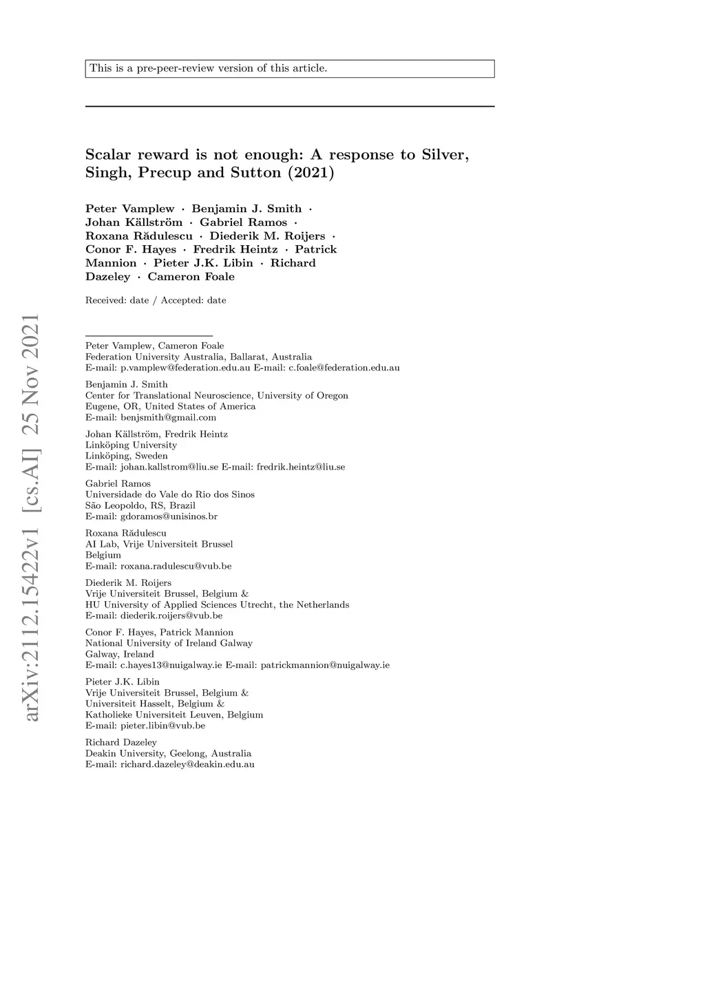 Scalar reward is not enough: A response to Silver, Singh, Precup and