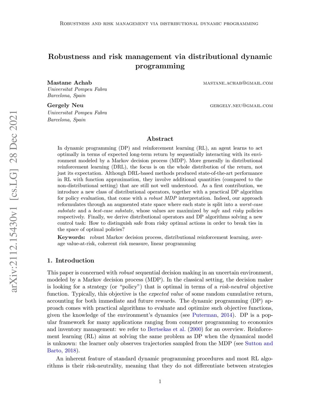 In dynamic programming (DP) and reinforcement learning (RL), an agent learns to act optimally in terms of expected long-term return by sequentially interacting with its environment modeled by a Markov decision process (MDP). More generally in distributional reinforcement learning (DRL), the focus is on the whole distribution of the return, not just its expectation. Although DRL-based methods produced state-of-the-art performance in RL with function approximation, they involve additional quantities (compared to the non-distributional setting) that are still not well understood. As a first contribution, we introduce a new class of distributional operators, together with a practical DP algorithm for policy evaluation, that come with a robust MDP interpretation. Indeed, our approach reformulates through an augmented state space where each state is split into a worst-case substate and a best-case substate, whose values are maximized by safe and risky policies respectively. Finally, we derive distributional operators and DP algorithms solving a new control task: How to distinguish safe from risky optimal actions in order to break ties in the space of optimal policies?