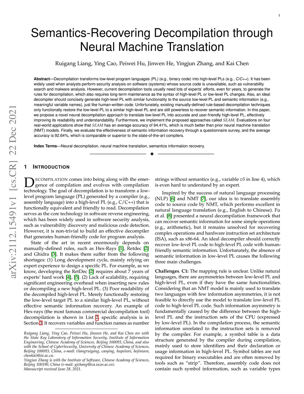 Decompilation transforms low-level program languages (PL) (e.g., binary code) into high-level PLs (e.g., C/C++). It has been widely used when analysts perform security analysis on software (systems) whose source code is unavailable, such as vulnerability search and malware analysis. However, current decompilation tools usually need lots of experts' efforts, even for years, to generate the rules for decompilation, which also requires long-term maintenance as the syntax of high-level PL or low-level PL changes. Also, an ideal decompiler should concisely generate high-level PL with similar functionality to the source low-level PL and semantic information (e.g., meaningful variable names), just like human-written code. Unfortunately, existing manually-defined rule-based decompilation techniques only functionally restore the low-level PL to a similar high-level PL and are still powerless to recover semantic information. In this paper, we propose a novel neural decompilation approach to translate low-level PL into accurate and user-friendly high-level PL, effectively improving its readability and understandability. Furthermore, we implement the proposed approaches called SEAM. Evaluations on four real-world applications show that SEAM has an average accuracy of 94.41%, which is much better than prior neural machine translation (NMT) models. Finally, we evaluate the effectiveness of semantic information recovery through a questionnaire survey, and the average accuracy is 92.64%, which is comparable or superior to the state-of-the-art compilers.