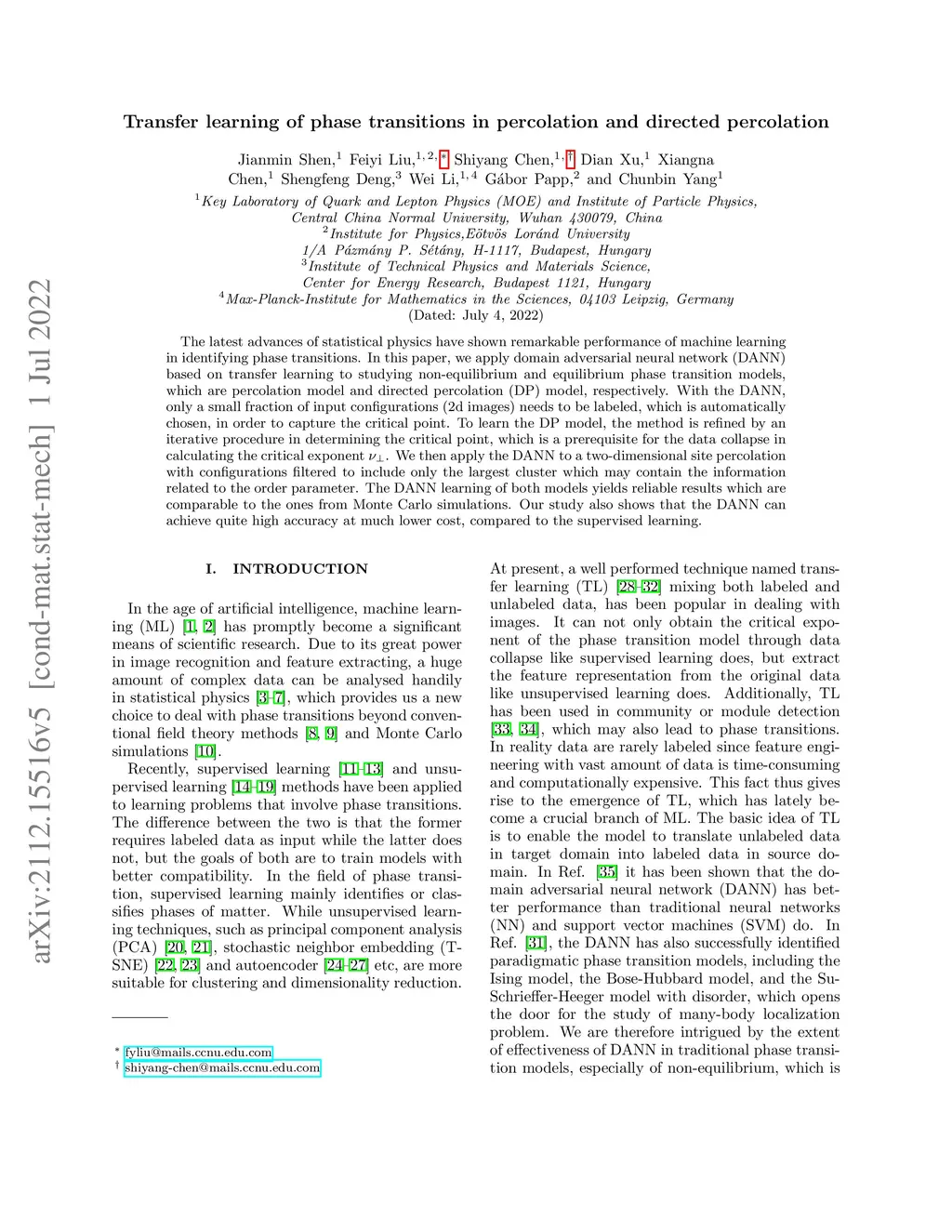 The latest advances of statistical physics have shown remarkable performance of machine learning in identifying phase transitions. In this paper, we apply domain adversarial neural network (DANN) based on transfer learning to studying non-equilibrium and equilibrium phase transition models, which are percolation model and directed percolation (DP) model, respectively. With the DANN, only a small fraction of input configurations (2d images) needs to be labeled, which is automatically chosen, in order to capture the critical point. To learn the DP model, the method is refined by an iterative procedure in determining the critical point, which is a prerequisite for the data collapse in calculating the critical exponent . We then apply the DANN to a two-dimensional site percolation with configurations filtered to include only the largest cluster which may contain the information related to the order parameter. The DANN learning of both models yields reliable results which are comparable to the ones from Monte Carlo simulations. Our study also shows that the DANN can achieve quite high accuracy at much lower cost, compared to the supervised learning.