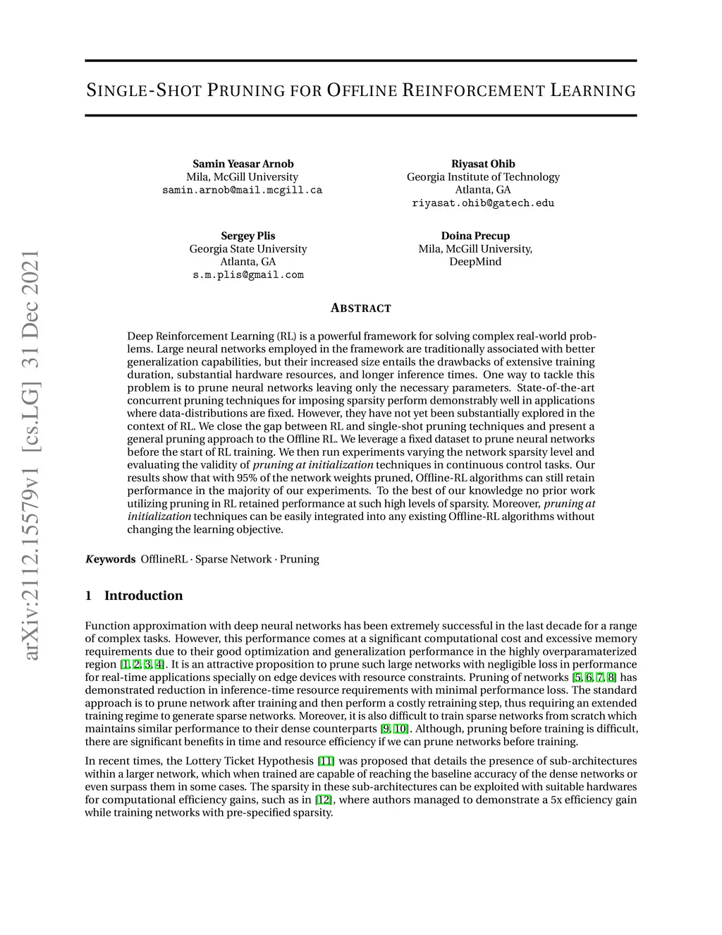 Deep Reinforcement Learning (RL) is a powerful framework for solving complex real-world problems. Large neural networks employed in the framework are traditionally associated with better generalization capabilities, but their increased size entails the drawbacks of extensive training duration, substantial hardware resources, and longer inference times. One way to tackle this problem is to prune neural networks leaving only the necessary parameters. State-of-the-art concurrent pruning techniques for imposing sparsity perform demonstrably well in applications where data distributions are fixed. However, they have not yet been substantially explored in the context of RL. We close the gap between RL and single-shot pruning techniques and present a general pruning approach to the Offline RL. We leverage a fixed dataset to prune neural networks before the start of RL training. We then run experiments varying the network sparsity level and evaluating the validity of pruning at initialization techniques in continuous control tasks. Our results show that with 95% of the network weights pruned, Offline-RL algorithms can still retain performance in the majority of our experiments. To the best of our knowledge, no prior work utilizing pruning in RL retained performance at such high levels of sparsity. Moreover, pruning at initialization techniques can be easily integrated into any existing Offline-RL algorithms without changing the learning objective.