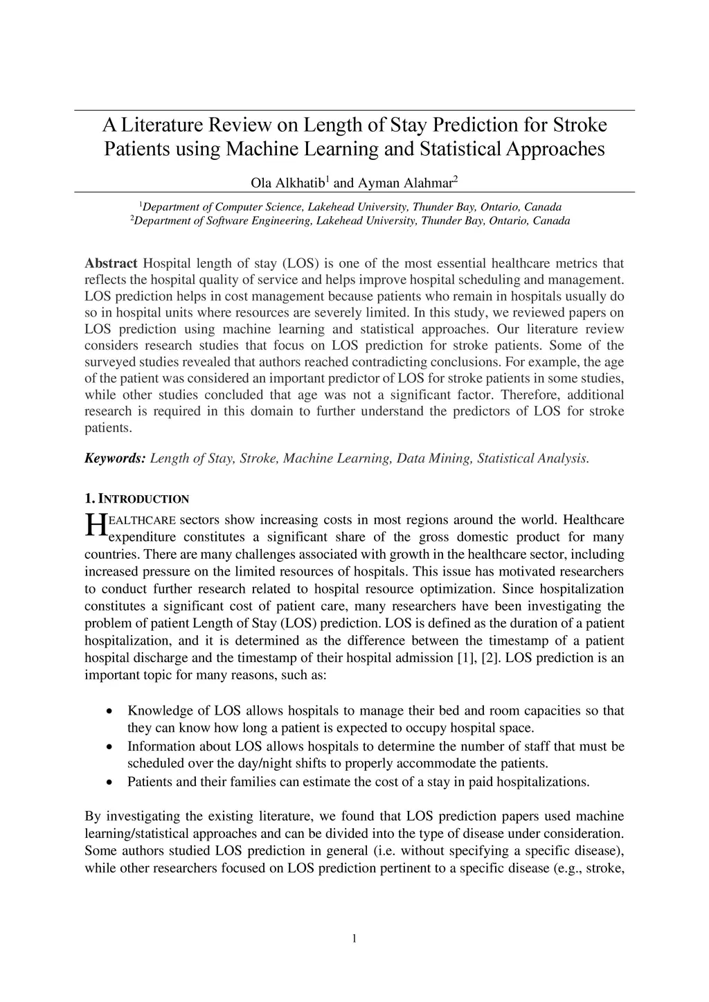 Hospital length of stay (LOS) is one of the most essential healthcare metrics that reflects the hospital quality of service and helps improve hospital scheduling and management. LOS prediction helps in cost management because patients who remain in hospitals usually do so in hospital units where resources are severely limited. In this study, we reviewed papers on LOS prediction using machine learning and statistical approaches. Our literature review considers research studies that focus on LOS prediction for stroke patients. Some of the surveyed studies revealed that authors reached contradicting conclusions. For example, the age of the patient was considered an important predictor of LOS for stroke patients in some studies, while other studies concluded that age was not a significant factor. Therefore, additional research is required in this domain to further understand the predictors of LOS for stroke patients.