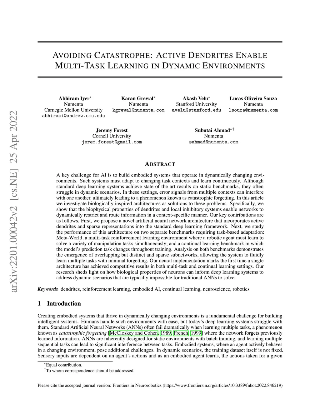 A key challenge for AI is to build embodied systems that operate in dynamically changing environments. Such systems must adapt to changing task contexts and learn continuously. Although standard deep learning systems achieve state of the art results on static benchmarks, they often struggle in dynamic scenarios. In these settings, error signals from multiple contexts can interfere with one another, ultimately leading to a phenomenon known as catastrophic forgetting. In this article we investigate biologically inspired architectures as solutions to these problems. Specifically, we show that the biophysical properties of dendrites and local inhibitory systems enable networks to dynamically restrict and route information in a context-specific manner. Our key contributions are as follows. First, we propose a novel artificial neural network architecture that incorporates active dendrites and sparse representations into the standard deep learning framework. Next, we study the performance of this architecture on two separate benchmarks requiring task-based adaptation: Meta-World, a multi-task reinforcement learning environment where a robotic agent must learn to solve a variety of manipulation tasks simultaneously; and a continual learning benchmark in which the model's prediction task changes throughout training. Analysis on both benchmarks demonstrates the emergence of overlapping but distinct and sparse subnetworks, allowing the system to fluidly learn multiple tasks with minimal forgetting. Our neural implementation marks the first time a single architecture has achieved competitive results on both multi-task and continual learning settings. Our research sheds light on how biological properties of neurons can inform deep learning systems to address dynamic scenarios that are typically impossible for traditional ANNs to solve.