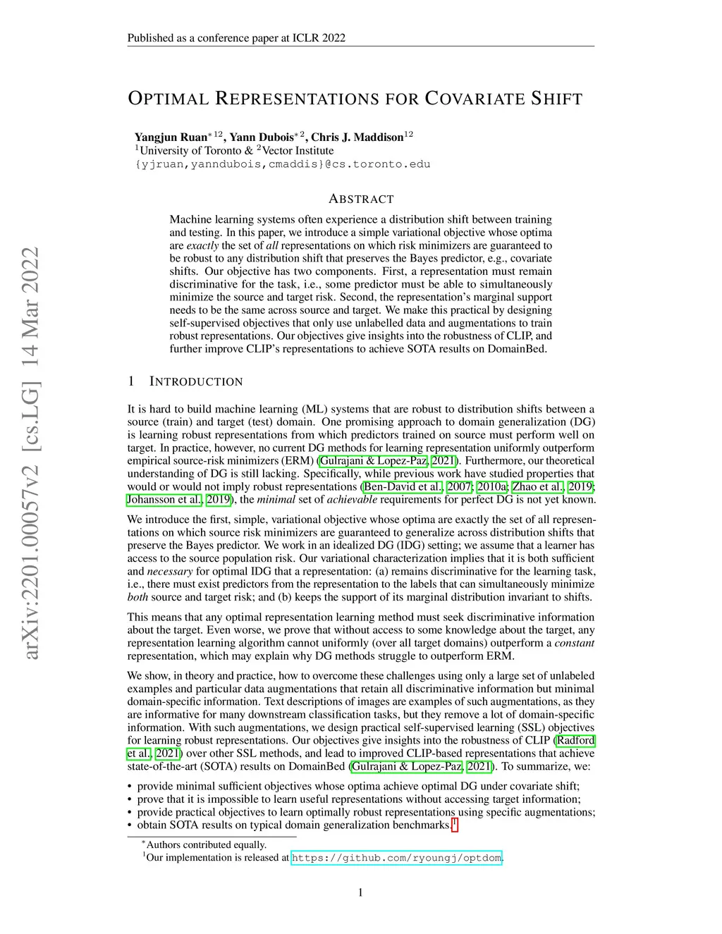 Machine learning systems often experience a distribution shift between training and testing. In this paper, we introduce a simple variational objective whose optima are exactly the set of all representations on which risk minimizers are guaranteed to be robust to any distribution shift that preserves the Bayes predictor, e.g., covariate shifts. Our objective has two components. First, a representation must remain discriminative for the task, i.e., some predictor must be able to simultaneously minimize the source and target risk. Second, the representation's marginal support needs to be the same across source and target. We make this practical by designing self-supervised objectives that only use unlabelled data and augmentations to train robust representations. Our objectives give insights into the robustness of CLIP, and further improve CLIP's representations to achieve SOTA results on DomainBed.