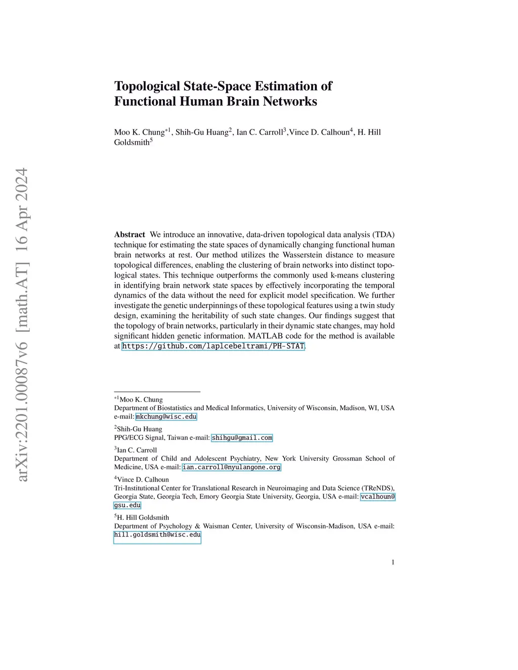 We introduce an innovative, data-driven topological data analysis (TDA) technique for estimating the state spaces of dynamically changing functional human brain networks at rest. Our method utilizes the Wasserstein distance to measure topological differences, enabling the clustering of brain networks into distinct topological states. This technique outperforms the commonly used k-means clustering in identifying brain network state spaces by effectively incorporating the temporal dynamics of the data without the need for explicit model specification. We further investigate the genetic underpinnings of these topological features using a twin study design, examining the heritability of such state changes. Our findings suggest that the topology of brain networks, particularly in their dynamic state changes, may hold significant hidden genetic information. MATLAB code for the method is available at https://github.com/laplcebeltrami/PH-STAT.