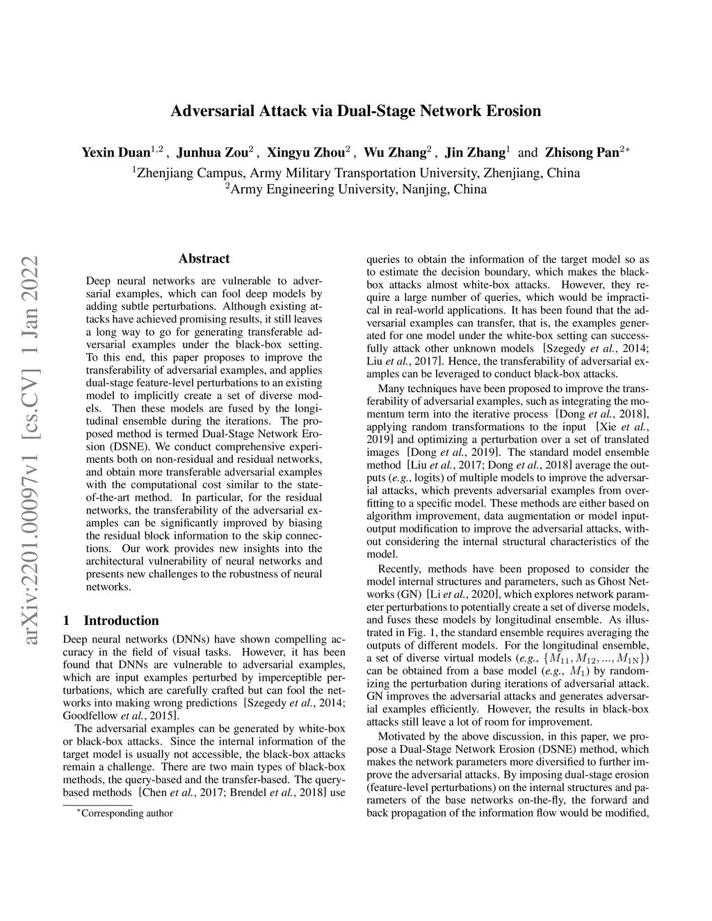 Deep neural networks are vulnerable to adversarial examples, which can fool deep models by adding subtle perturbations. Although existing attacks have achieved promising results, it still leaves a long way to go for generating transferable adversarial examples under the black-box setting. To this end, this paper proposes to improve the transferability of adversarial examples, and applies dual-stage feature-level perturbations to an existing model to implicitly create a set of diverse models. Then these models are fused by the longitudinal ensemble during the iterations. The proposed method is termed Dual-Stage Network Erosion (DSNE). We conduct comprehensive experiments both on non-residual and residual networks, and obtain more transferable adversarial examples with the computational cost similar to the state-of-the-art method. In particular, for the residual networks, the transferability of the adversarial examples can be significantly improved by biasing the residual block information to the skip connections. Our work provides new insights into the architectural vulnerability of neural networks and presents new challenges to the robustness of neural networks.