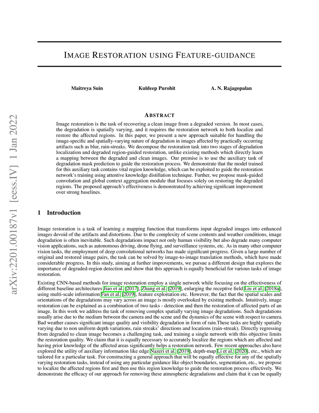 Image restoration is the task of recovering a clean image from a degraded version. In most cases, the degradation is spatially varying, and it requires the restoration network to both localize and restore the affected regions. In this paper, we present a new approach suitable for handling the image-specific and spatially-varying nature of degradation in images affected by practically occurring artifacts such as blur, rain-streaks. We decompose the restoration task into two stages of degradation localization and degraded region-guided restoration, unlike existing methods which directly learn a mapping between the degraded and clean images. Our premise is to use the auxiliary task of degradation mask prediction to guide the restoration process. We demonstrate that the model trained for this auxiliary task contains vital region knowledge, which can be exploited to guide the restoration network's training using attentive knowledge distillation technique. Further, we propose mask-guided convolution and global context aggregation module that focuses solely on restoring the degraded regions. The proposed approach's effectiveness is demonstrated by achieving significant improvement over strong baselines.
