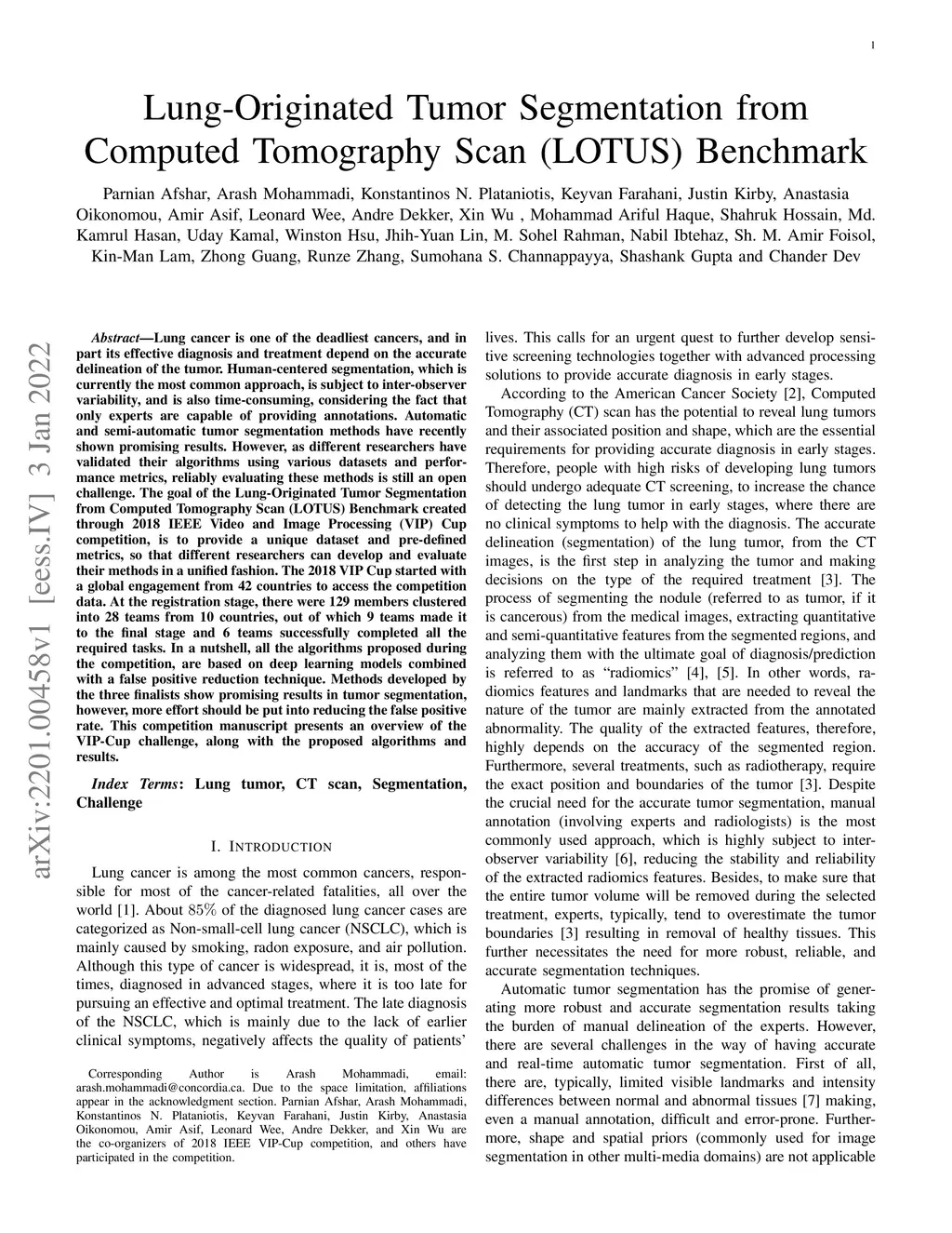 Lung cancer is one of the deadliest cancers, and in part its effective diagnosis and treatment depend on the accurate delineation of the tumor. Human-centered segmentation, which is currently the most common approach, is subject to inter-observer variability, and is also time-consuming, considering the fact that only experts are capable of providing annotations. Automatic and semi-automatic tumor segmentation methods have recently shown promising results. However, as different researchers have validated their algorithms using various datasets and performance metrics, reliably evaluating these methods is still an open challenge. The goal of the Lung-Originated Tumor Segmentation from Computed Tomography Scan (LOTUS) Benchmark created through 2018 IEEE Video and Image Processing (VIP) Cup competition, is to provide a unique dataset and pre-defined metrics, so that different researchers can develop and evaluate their methods in a unified fashion. The 2018 VIP Cup started with a global engagement from 42 countries to access the competition data. At the registration stage, there were 129 members clustered into 28 teams from 10 countries, out of which 9 teams made it to the final stage and 6 teams successfully completed all the required tasks. In a nutshell, all the algorithms proposed during the competition, are based on deep learning models combined with a false positive reduction technique. Methods developed by the three finalists show promising results in tumor segmentation, however, more effort should be put into reducing the false positive rate. This competition manuscript presents an overview of the VIP-Cup challenge, along with the proposed algorithms and results.