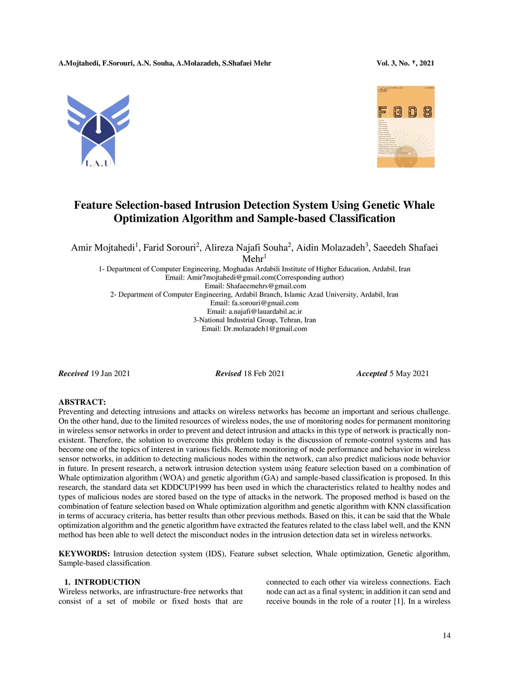 Preventing and detecting intrusions and attacks on wireless networks has become an important and serious challenge. On the other hand, due to the limited resources of wireless nodes, the use of monitoring nodes for permanent monitoring in wireless sensor networks in order to prevent and detect intrusion and attacks in this type of network is practically non-existent. Therefore, the solution to overcome this problem today is the discussion of remote-control systems and has become one of the topics of interest in various fields. Remote monitoring of node performance and behavior in wireless sensor networks, in addition to detecting malicious nodes within the network, can also predict malicious node behavior in future. In present research, a network intrusion detection system using feature selection based on a combination of Whale optimization algorithm (WOA) and genetic algorithm (GA) and sample-based classification is proposed. In this research, the standard data set KDDCUP1999 has been used in which the characteristics related to healthy nodes and types of malicious nodes are stored based on the type of attacks in the network. The proposed method is based on the combination of feature selection based on Whale optimization algorithm and genetic algorithm with KNN classification in terms of accuracy criteria, has better results than other previous methods. Based on this, it can be said that the Whale optimization algorithm and the genetic algorithm have extracted the features related to the class label well, and the KNN method has been able to well detect the misconduct nodes in the intrusion detection data set in wireless networks.