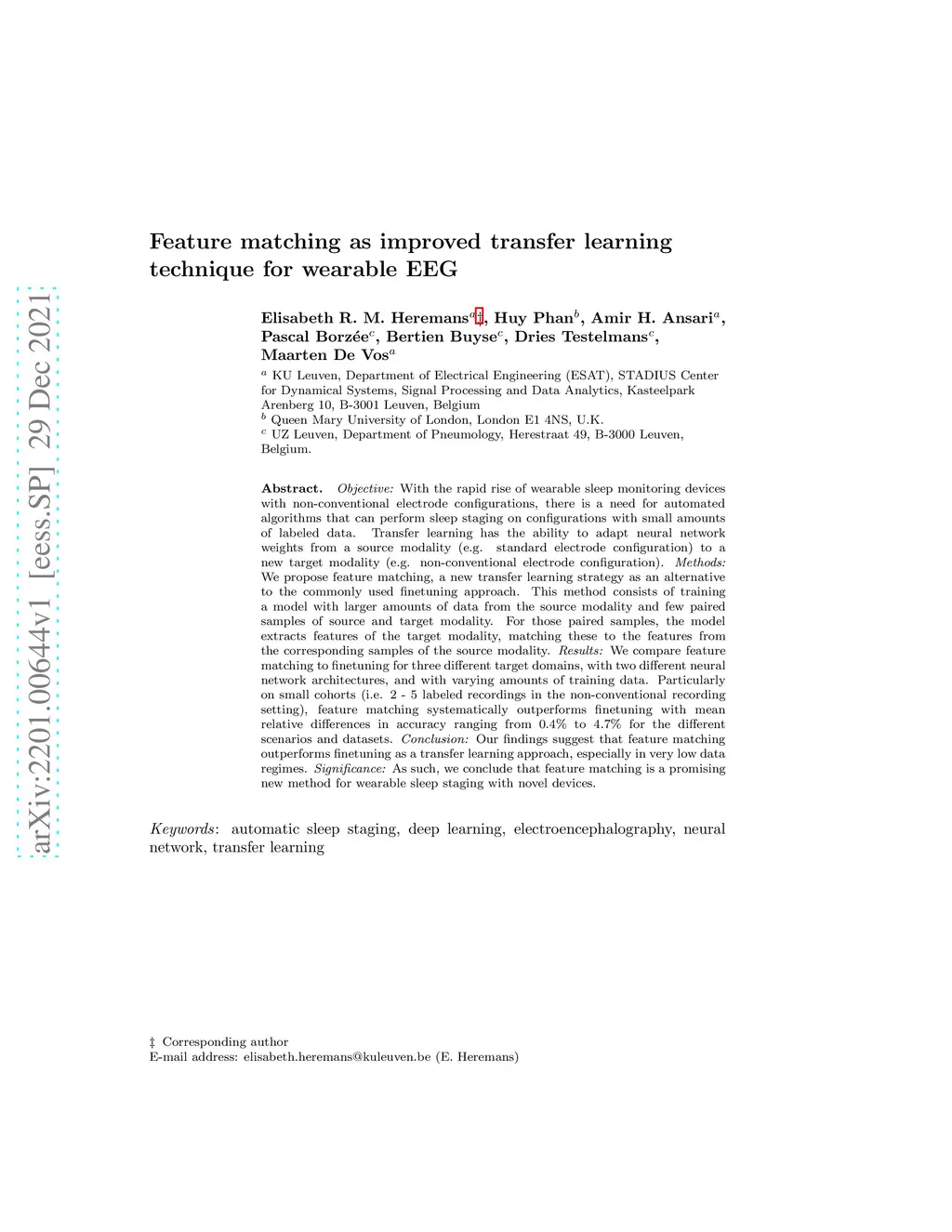 Objective: With the rapid rise of wearable sleep monitoring devices with non-conventional electrode configurations, there is a need for automated algorithms that can perform sleep staging on configurations with small amounts of labeled data. Transfer learning has the ability to adapt neural network weights from a source modality (e.g. standard electrode configuration) to a new target modality (e.g. non-conventional electrode configuration). Methods: We propose feature matching, a new transfer learning strategy as an alternative to the commonly used finetuning approach. This method consists of training a model with larger amounts of data from the source modality and few paired samples of source and target modality. For those paired samples, the model extracts features of the target modality, matching these to the features from the corresponding samples of the source modality. Results: We compare feature matching to finetuning for three different target domains, with two different neural network architectures, and with varying amounts of training data. Particularly on small cohorts (i.e. 2 - 5 labeled recordings in the non-conventional recording setting), feature matching systematically outperforms finetuning with mean relative differences in accuracy ranging from 0.4% to 4.7% for the different scenarios and datasets. Conclusion: Our findings suggest that feature matching outperforms finetuning as a transfer learning approach, especially in very low data regimes. Significance: As such, we conclude that feature matching is a promising new method for wearable sleep staging with novel devices.