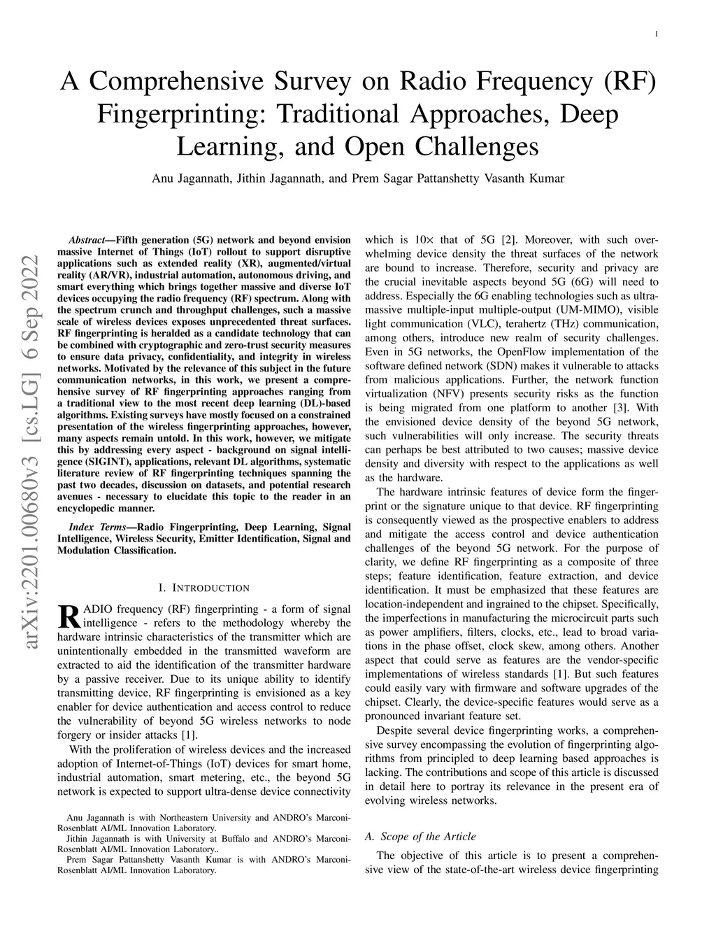 Fifth generation (5G) network and beyond envision massive Internet of Things (IoT) rollout to support disruptive applications such as extended reality (XR), augmented/virtual reality (AR/VR), industrial automation, autonomous driving, and smart everything which brings together massive and diverse IoT devices occupying the radio frequency (RF) spectrum. Along with the spectrum crunch and throughput challenges, such a massive scale of wireless devices exposes unprecedented threat surfaces. RF fingerprinting is heralded as a candidate technology that can be combined with cryptographic and zero-trust security measures to ensure data privacy, confidentiality, and integrity in wireless networks. Motivated by the relevance of this subject in the future communication networks, in this work, we present a comprehensive survey of RF fingerprinting approaches ranging from a traditional view to the most recent deep learning (DL)-based algorithms. Existing surveys have mostly focused on a constrained presentation of the wireless fingerprinting approaches, however, many aspects remain untold. In this work, however, we mitigate this by addressing every aspect - background on signal intelligence (SIGINT), applications, relevant DL algorithms, systematic literature review of RF fingerprinting techniques spanning the past two decades, discussion on datasets, and potential research avenues - necessary to elucidate this topic to the reader in an encyclopedic manner.