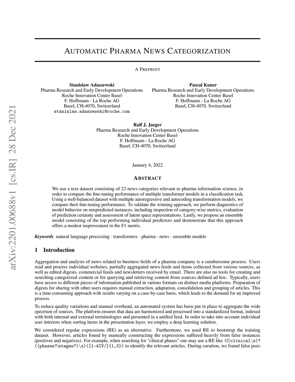 We use a text dataset consisting of 23 news categories relevant to pharma information science, in order to compare the fine-tuning performance of multiple transformer models in a classification task. Using a well-balanced dataset with multiple autoregressive and autocoding transformation models, we compare their fine-tuning performance. To validate the winning approach, we perform diagnostics of model behavior on mispredicted instances, including inspection of category-wise metrics, evaluation of prediction certainty and assessment of latent space representations. Lastly, we propose an ensemble model consisting of the top performing individual predictors and demonstrate that this approach offers a modest improvement in the F1 metric.