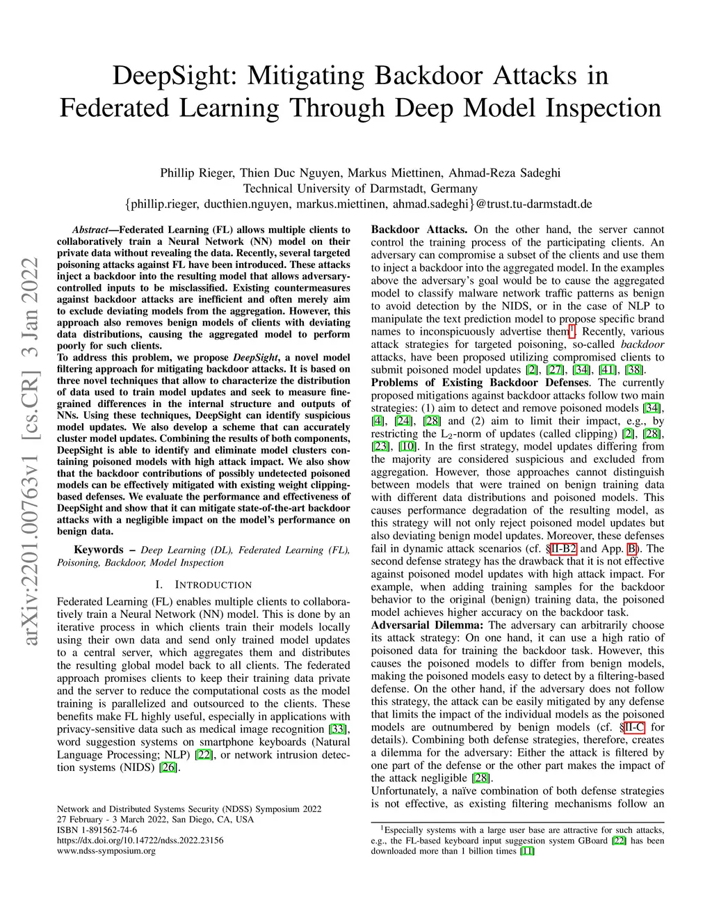 DeepSight: Mitigating Backdoor Attacks in Federated Learning Through