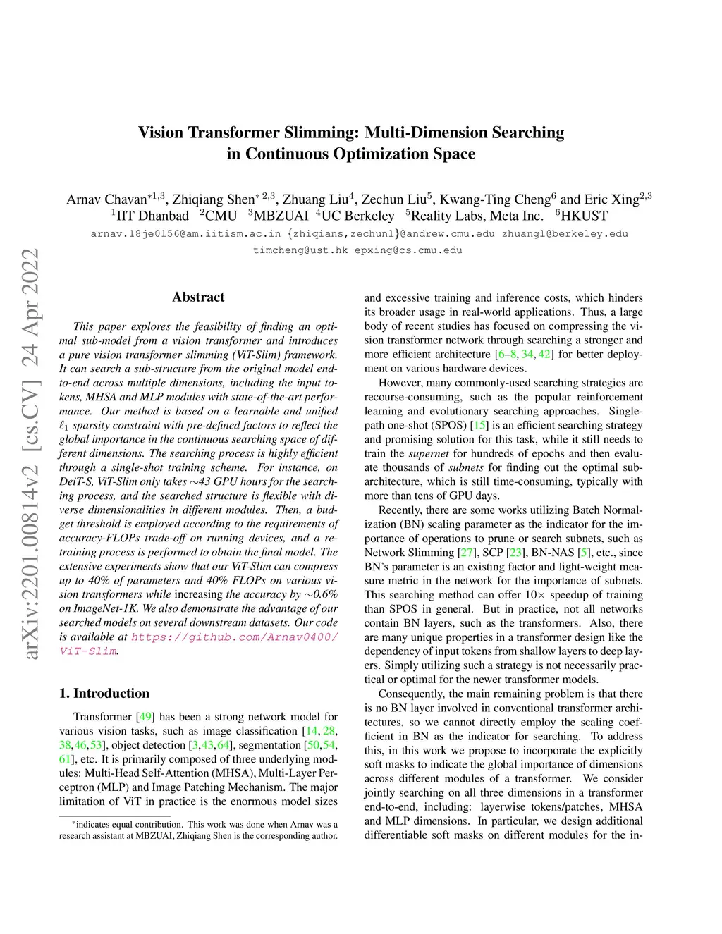 This paper explores the feasibility of finding an optimal sub-model from a vision transformer and introduces a pure vision transformer slimming (ViT-Slim) framework. It can search a sub-structure from the original model end-to-end across multiple dimensions, including the input tokens, MHSA and MLP modules with state-of-the-art performance. Our method is based on a learnable and unified sparsity constraint with pre-defined factors to reflect the global importance in the continuous searching space of different dimensions. The searching process is highly efficient through a single-shot training scheme. For instance, on DeiT-S, ViT-Slim only takes ~43 GPU hours for the searching process, and the searched structure is flexible with diverse dimensionalities in different modules. Then, a budget threshold is employed according to the requirements of accuracy-FLOPs trade-off on running devices, and a re-training process is performed to obtain the final model. The extensive experiments show that our ViT-Slim can compress up to 40% of parameters and 40% FLOPs on various vision transformers while increasing the accuracy by ~0.6% on ImageNet. We also demonstrate the advantage of our searched models on several downstream datasets. Our code is available at https://github.com/Arnav0400/ViT-Slim.