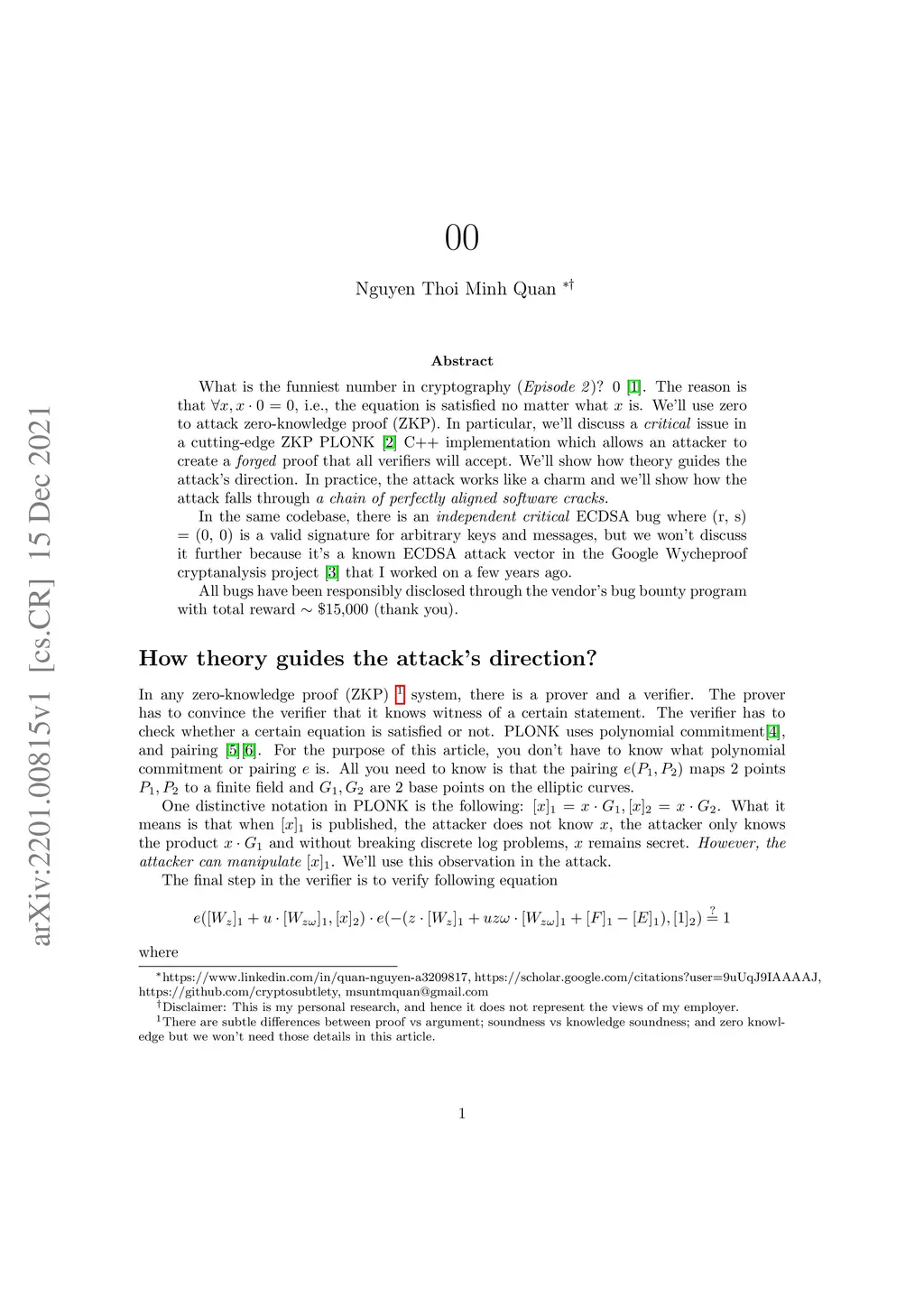 What is the funniest number in cryptography (Episode 2)? 0 [1]. The reason is that , i.e., the equation is satisfied no matter what is. We'll use zero to attack zero-knowledge proof (ZKP). In particular, we'll discuss a critical issue in a cutting-edge ZKP PLONK [2] C++ implementation which allows an attacker to create a forged proof that all verifiers will accept. We'll show how theory guides the attack's direction. In practice, the attack works like a charm and we'll show how the attack falls through a chain of perfectly aligned software cracks. In the same codebase, there is an independent critical ECDSA bug where (r, s) = (0, 0) is a valid signature for arbitrary keys and messages, but we won't discuss it further because it's a known ECDSA attack vector in the Google Wycheproof cryptanalysis project [3] that I worked on a few years ago. All bugs have been responsibly disclosed through the vendor's bug bounty program with total reward \sim \15,000$ (thank you).